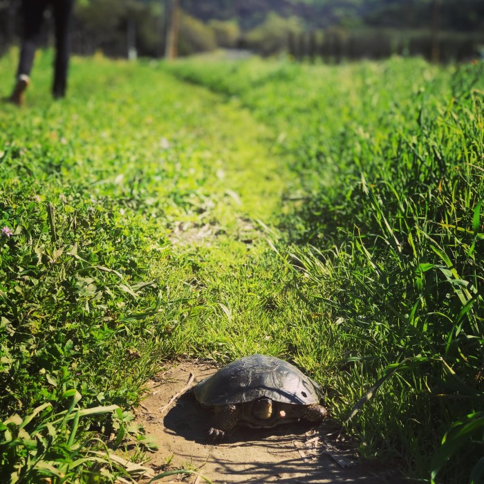 It was San Francisco, alright? If there is a “man with a duck” anywhere, San Francisco would be the place. We were on our way to Napa Valley, and one morning, my wife and I took a walk in the vineyards – it was after a day of rain, so who did we find on our path that morning getting some sun?