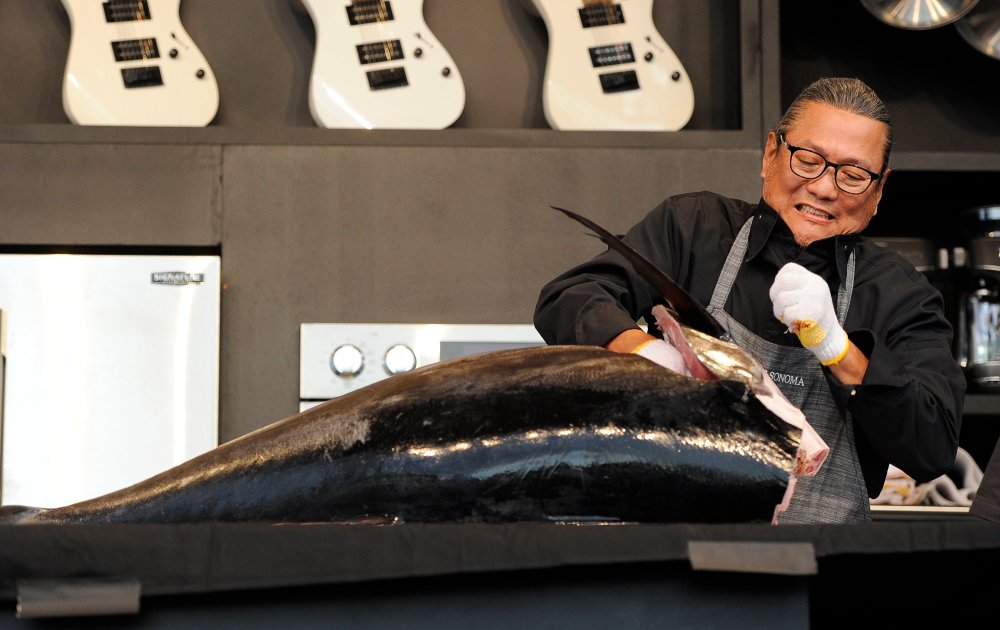 Masaharu Morimoto sets a Guinness World Record at the Williams Sonoma Culinary Stage for slicing 100 pieces of 3.5 ounces of tuna from a 205 pound fish in 12 minutes and 49 seconds. (Chris Riley–Times-Herald)