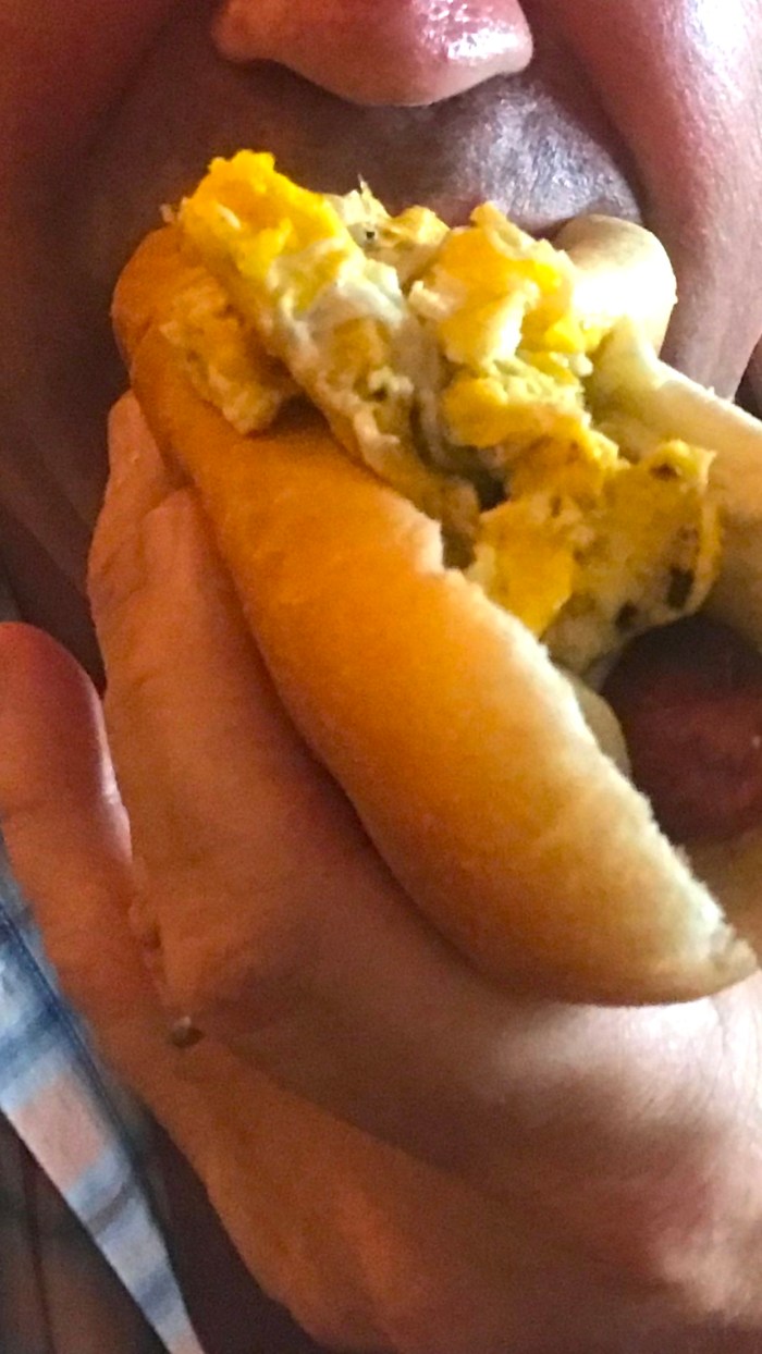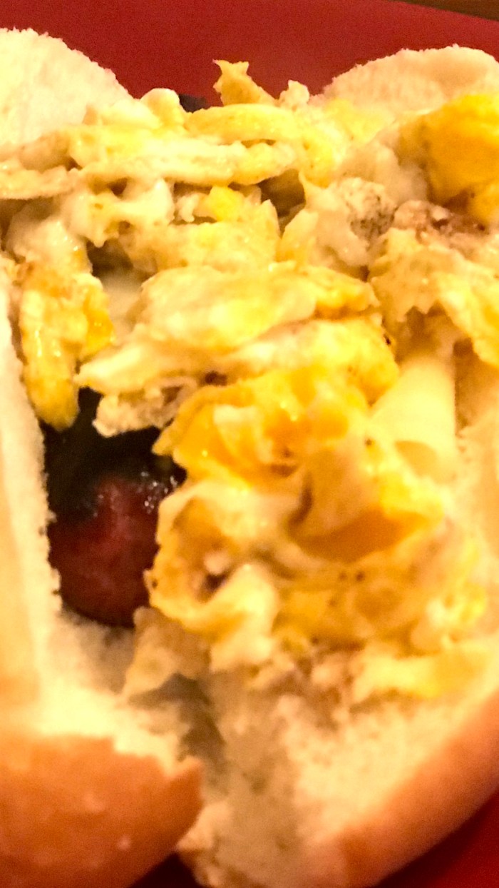 Well, you know what happened next: I topped my hot dogs with the scrambled eggs – now it was time to bite down on this food mashup!