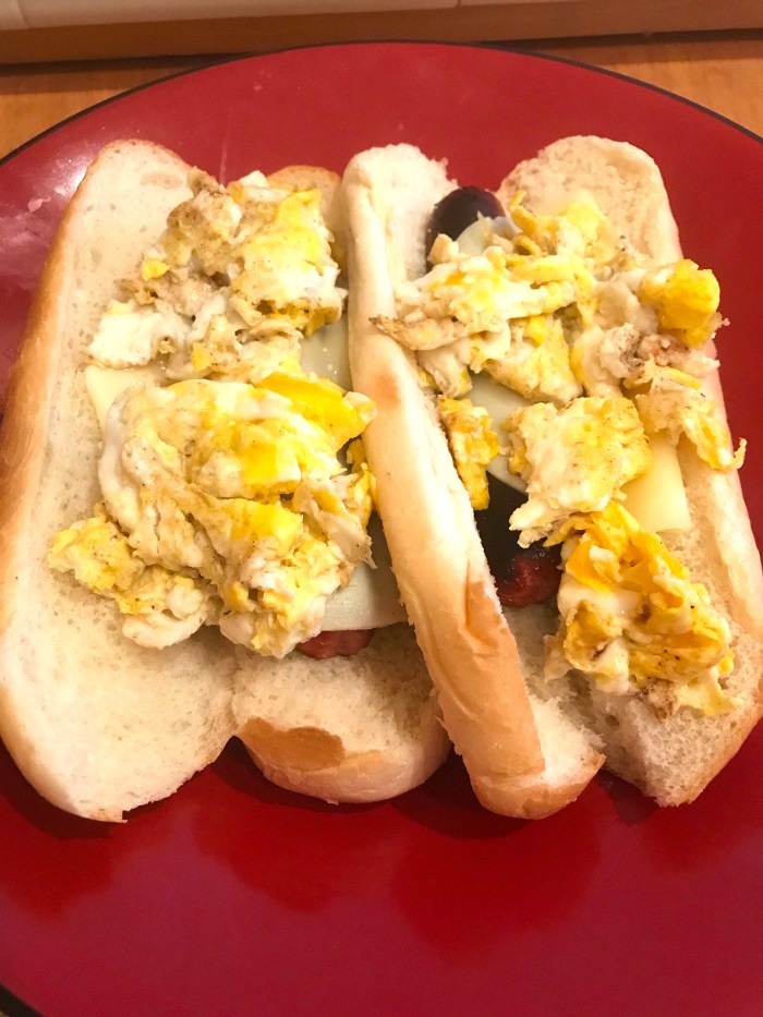You can see I found myself with a couple of eggs, a few hot dogs, the buns that house them, a few slices of provolone cheese and a bulb of garlic…before you ask me how they all ended up on the same plate, let’s look at a traditional American breakfast: