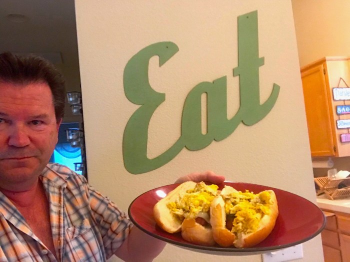 You see? “Hot Dogs And Eggs” doesn’t sound nearly as twisted as “Scrambled Egg Hot Dogs” – and it all began because I had two leftover eggs I wanted to cook up for dinner – oh, and I had a few “other” things sitting around as well: