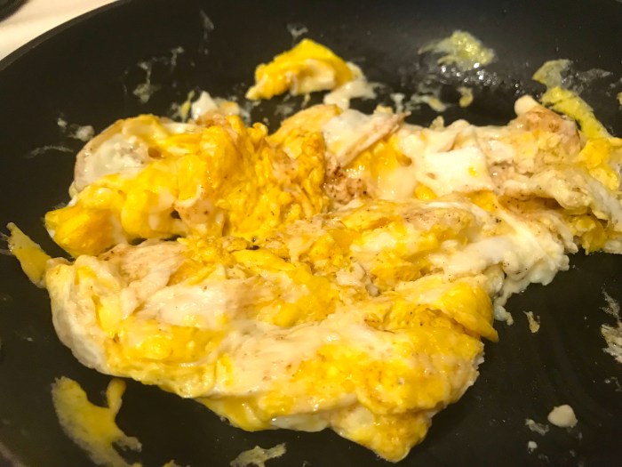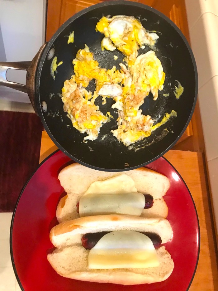 I used the same pan for the eggs, so that’s a nice bit of “hot dog oil” infused in the eggs, along with salt and pepper.