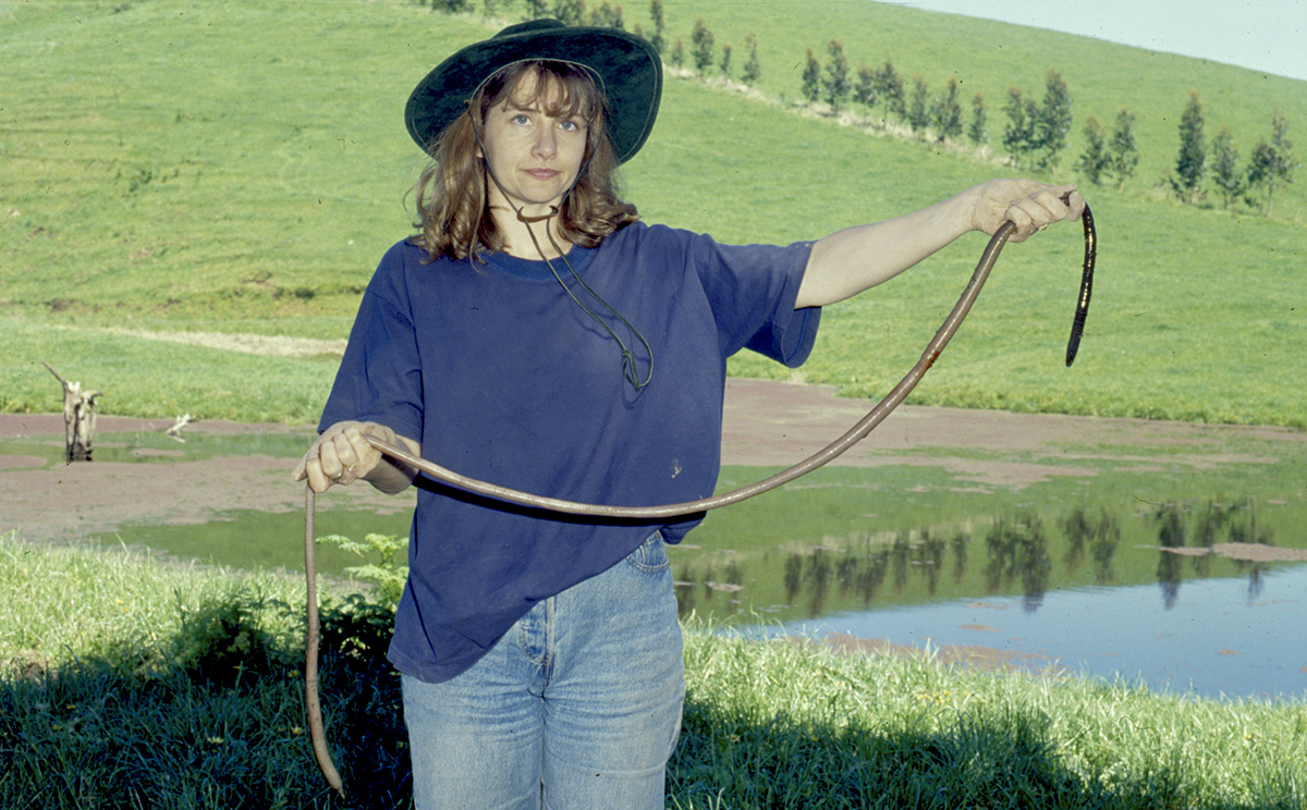 Woman holding a Giant Gippsland Earthworm during a Museum Victoria field trip c.1980