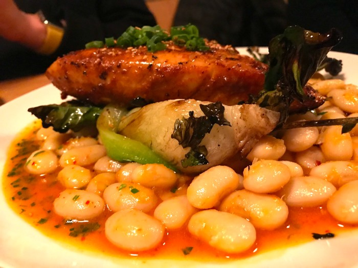 Yes, this incredible fish dish is Opah with a chili-honey rub, butter beans, broccoli di ciccio, mei qing choy and soy brown butter!
