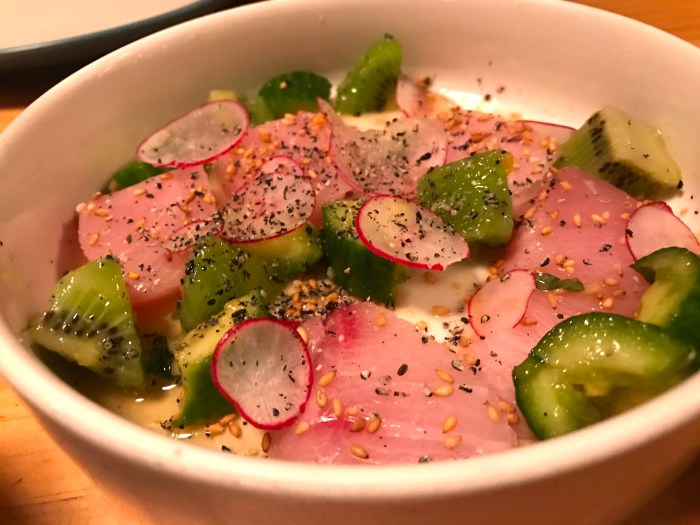 We wanted to try two other dishes from the upper left menu: first up was Yellowtail Sashimi with kiwi, black sesame, citrus kasha and crushed cucumbers…