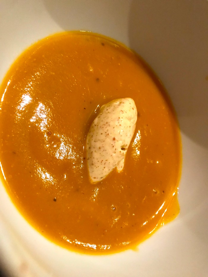 This Butternut Squash Soup has Mustard Ice Cream in the middle! And it was delicious! The icy cold mouth feel allows the mustard flavor to slowly envelope your taste buds.