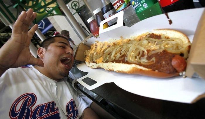 What started as a goofy food experiment at Rangers Ballpark in Arlington, Texas became instead one of their most popular food items — two-foot-long hot dog known as the “Boomstick!”