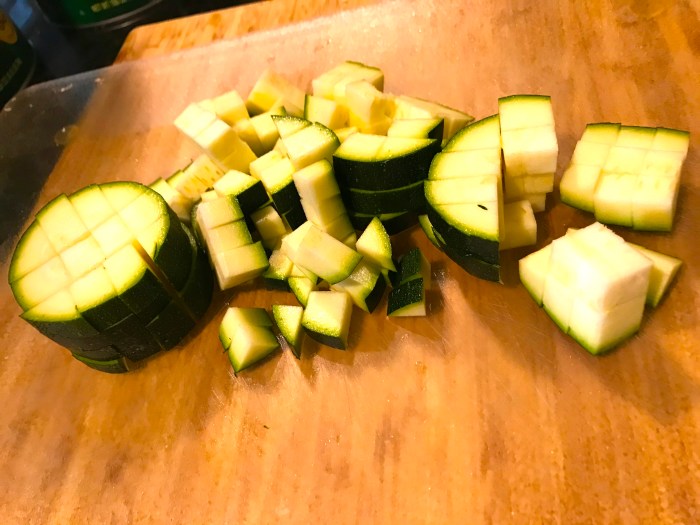 Dice your zucchini so it’s ready to go, then dice your garlic and onion and toss it in a pan!