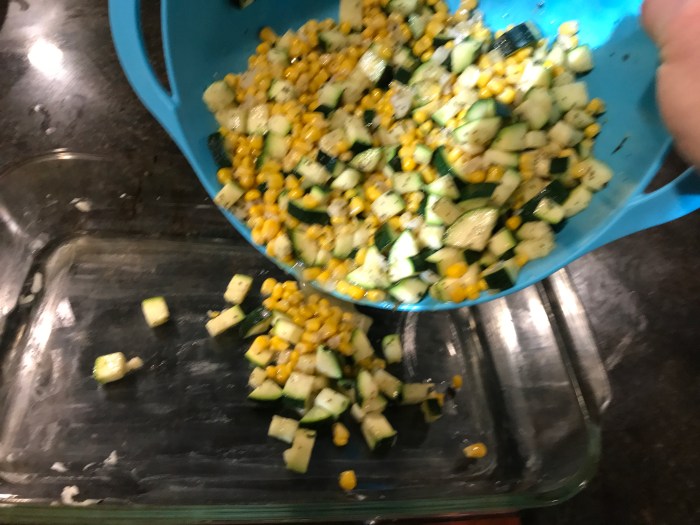 Combine your cooked zucchini, onion and garlic in a bowl with as much corn as you can handle corn and mix together.