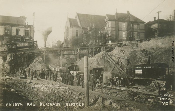 This is the regrade of Seattle’s Fourth Avenue in 1907. This photo, and many more, exist on the official O.T. Frasch website, which you can explore here: