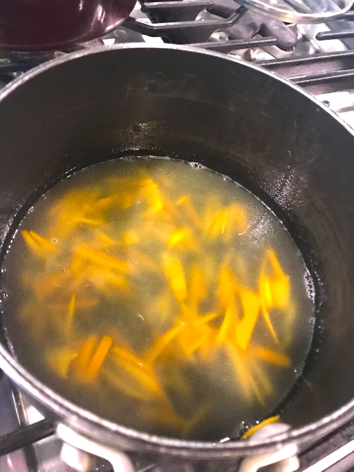 As the recipe says, bring the rinds to a boil in water and then simmer for ten minutes….then, you drain them and make the sauce by adding some of the drippings from the game hens – or butter, and the Grand Marnier…I used Cointreau instead, and I didn’t film it “flaming” it in order to avoid a kitchen disaster!