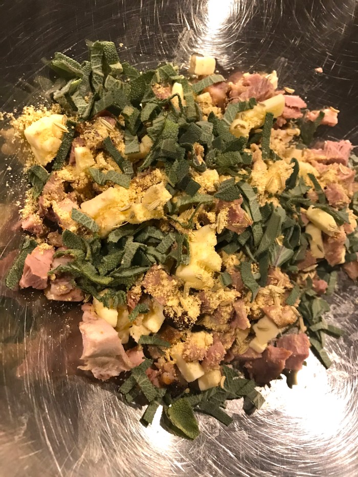 Chef Franklin’s recipe also called for 120g of smoky bacon, but since my Ssam butt was already nicely seasoned and fatty, I didn’t add more…instead, I added a teaspoon of fennel seeds, a teaspoon of mustard, salt, pepper, lots of sage and more butter – 100g worth!