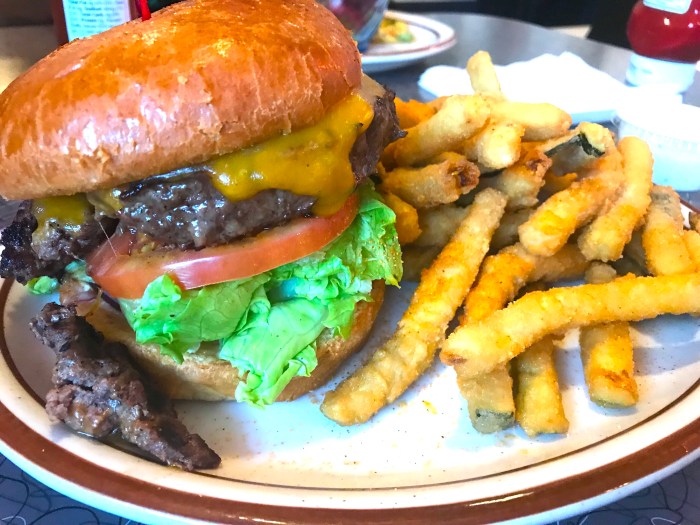 I had a classic All-American burger, piled with lettuce, tomato, pickle and ketchup…