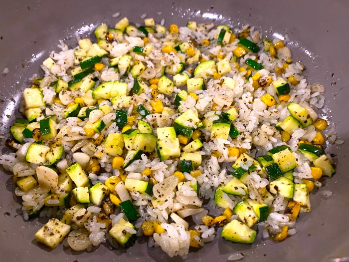 Finally I add some corn and cooked rice…I made the rice separately, so all I have to do is just bring all of it to life in the pan together for about five minutes…