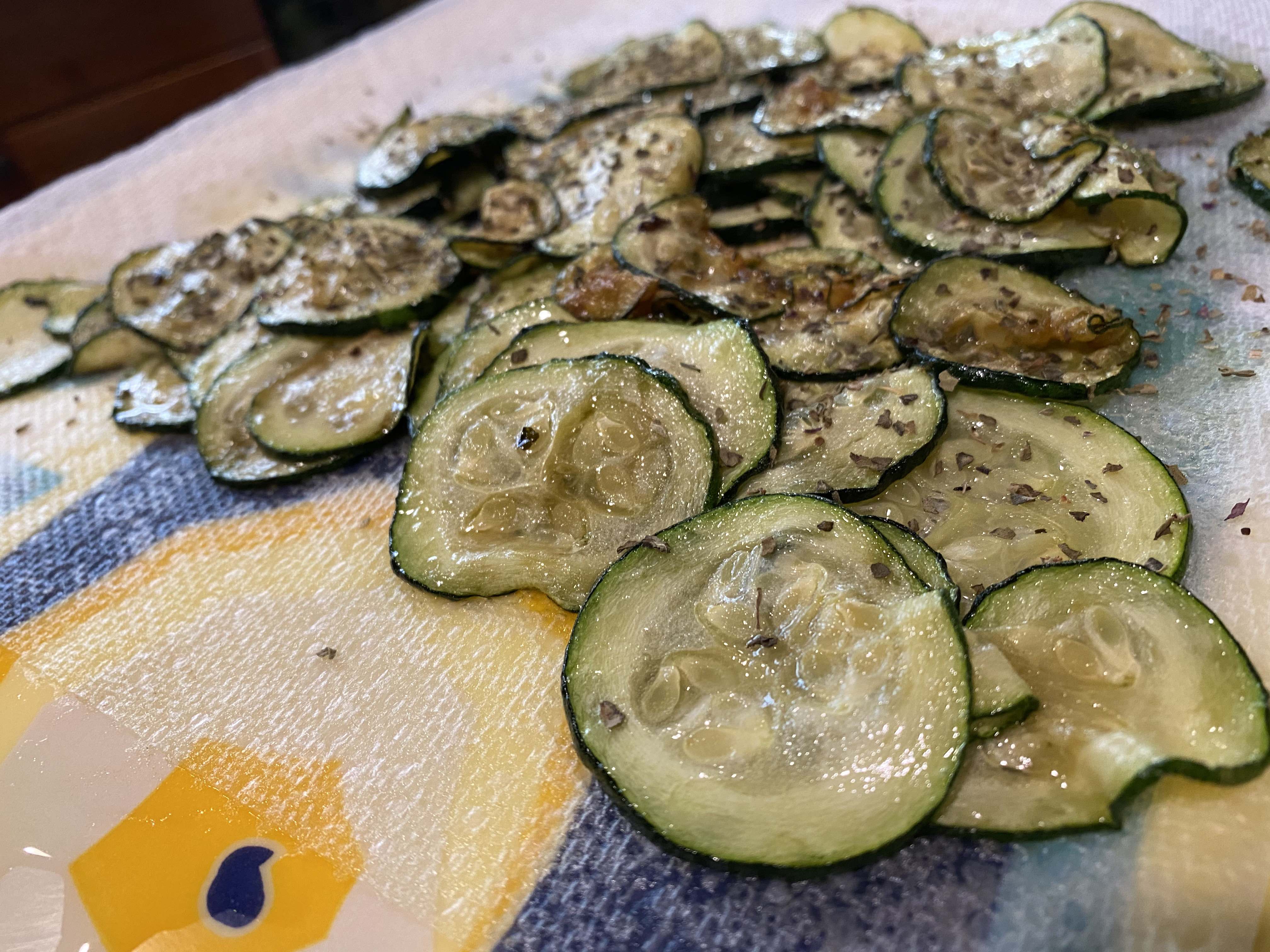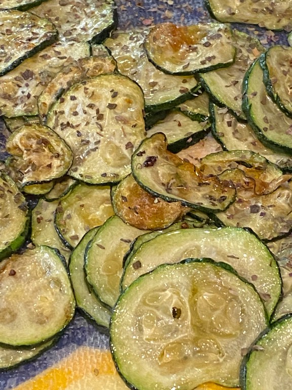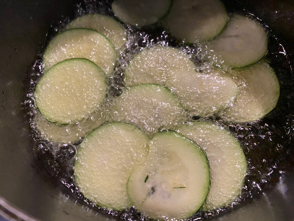 Slice the zucchini very thin, then heat up your olive oil in a pan and drop them in!