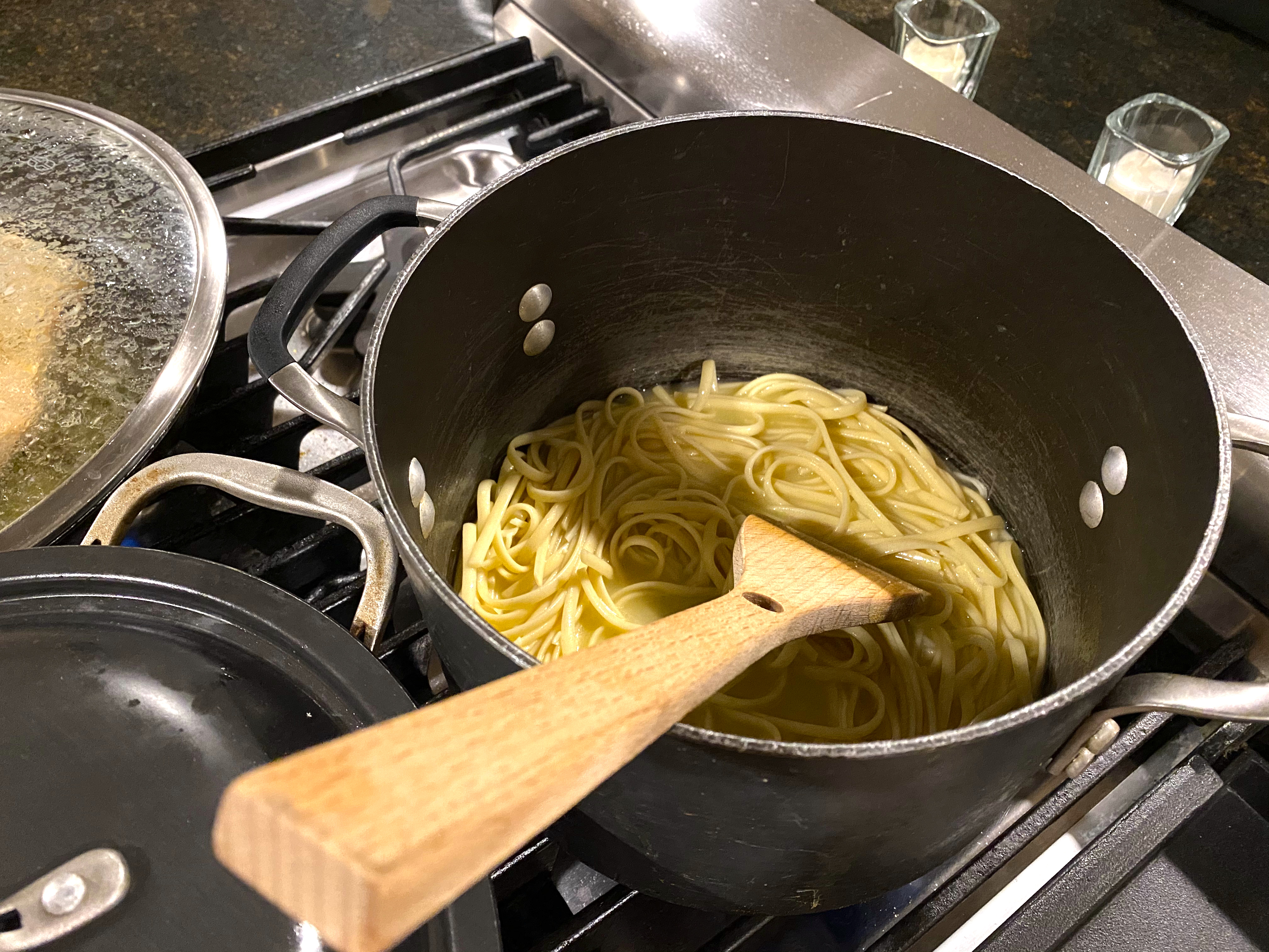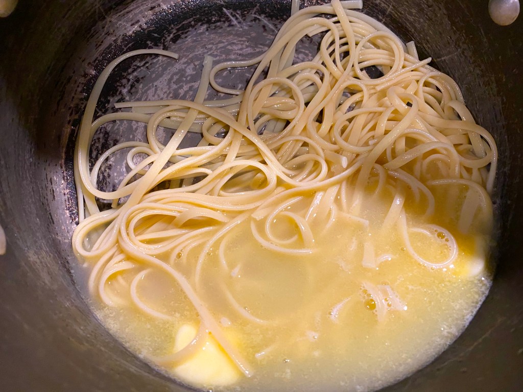 When it’s time for dinner, cook your spaghetti al dente, so it’s still a bit firm. I actually decided to cook my Linguine in very little water, then drained a bit, added some butter and let it simmer and soak!