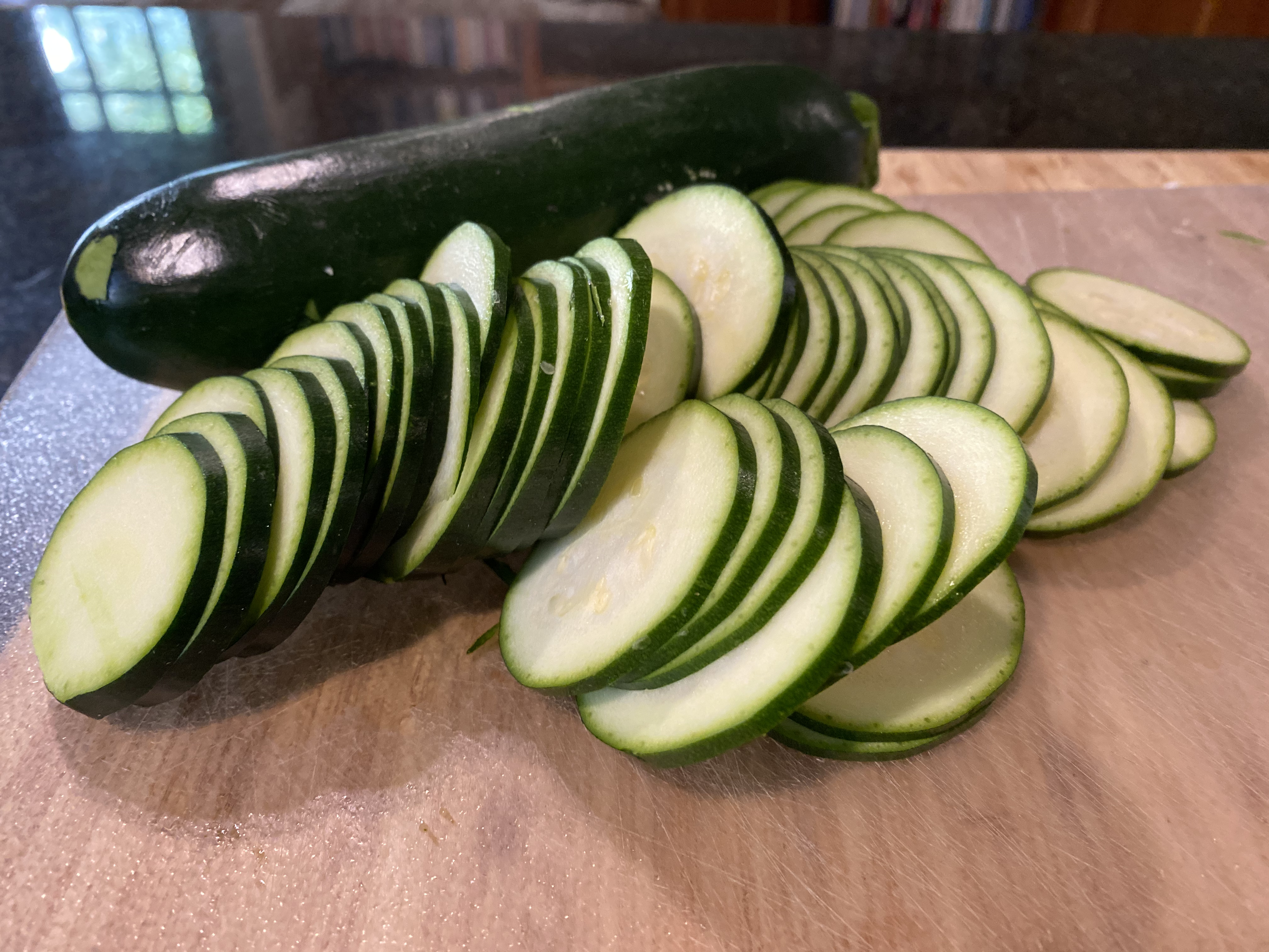 The recipe had all of the zucchini going in at this point, but I chose to reheat a bit of the zucchini slices separately so I could do this:
