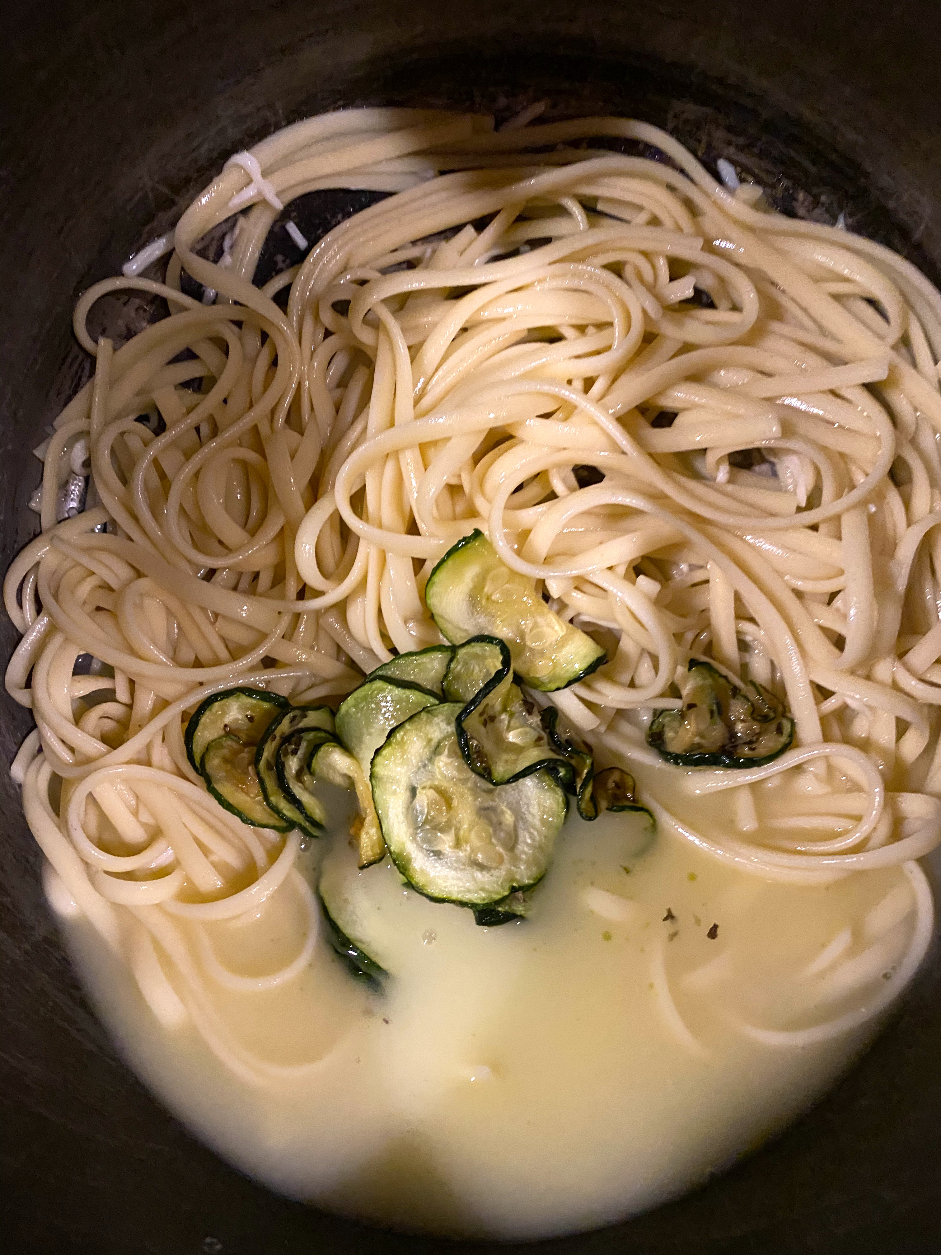 Next up, I dropped some of my Zucchini into the pasta to mix it in…that is a buttery creamy broth at the bottom now.