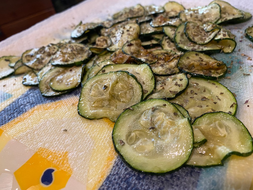 Take the Zucchini out with a slotted spoon and set on paper towels to drain.