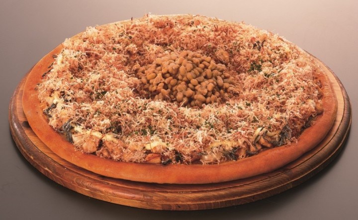 First, look at this massive pie! It’s a pizza loaded up with “Okonomiyaki”, which is a Japanese pancake containing a variety of ingredients. The name is derived from the word okonomi, meaning “what you like” or “what you want”, and yaki meaning “grilled” or “cooked” – and they’ve taken it to the extreme!