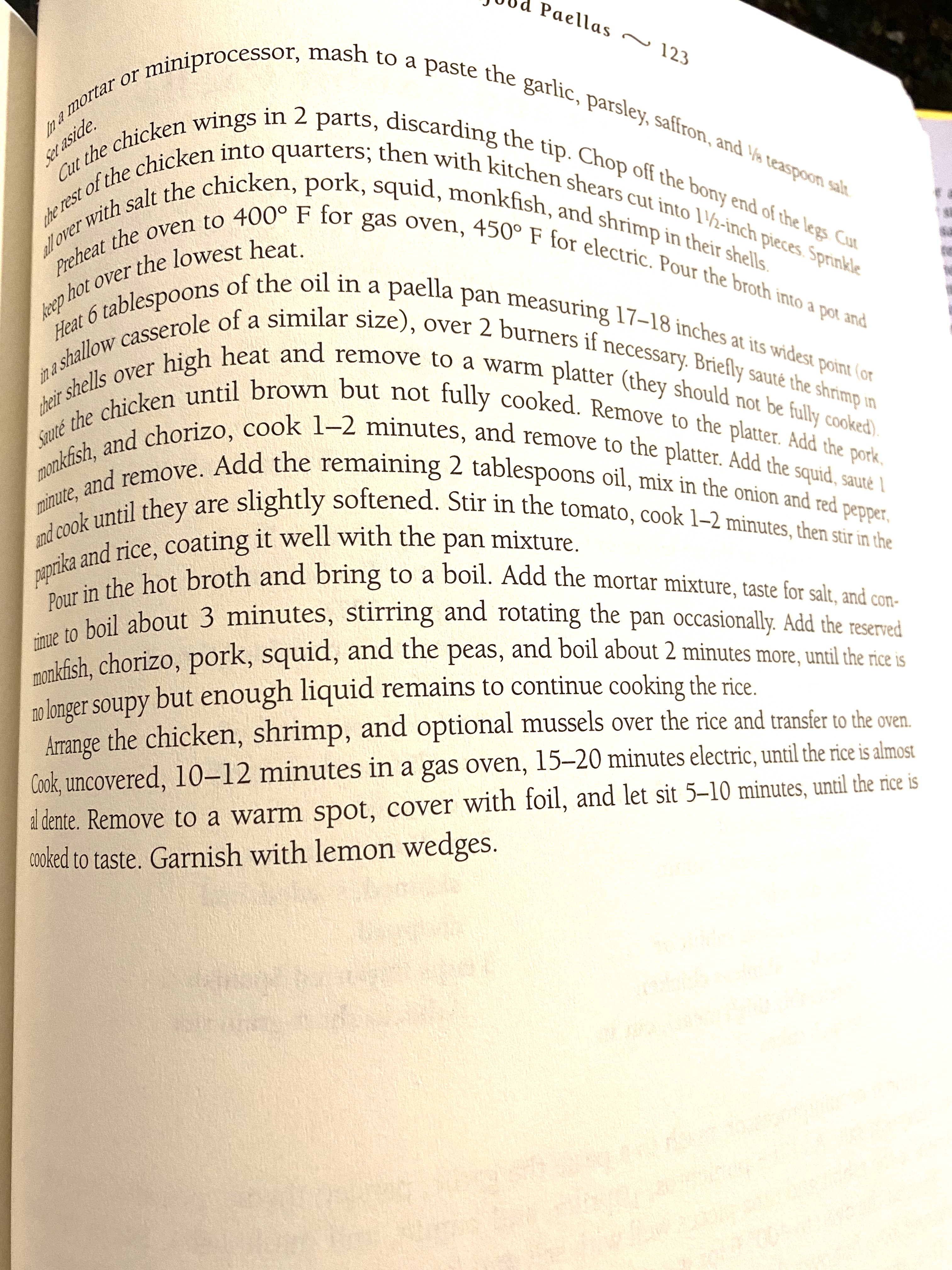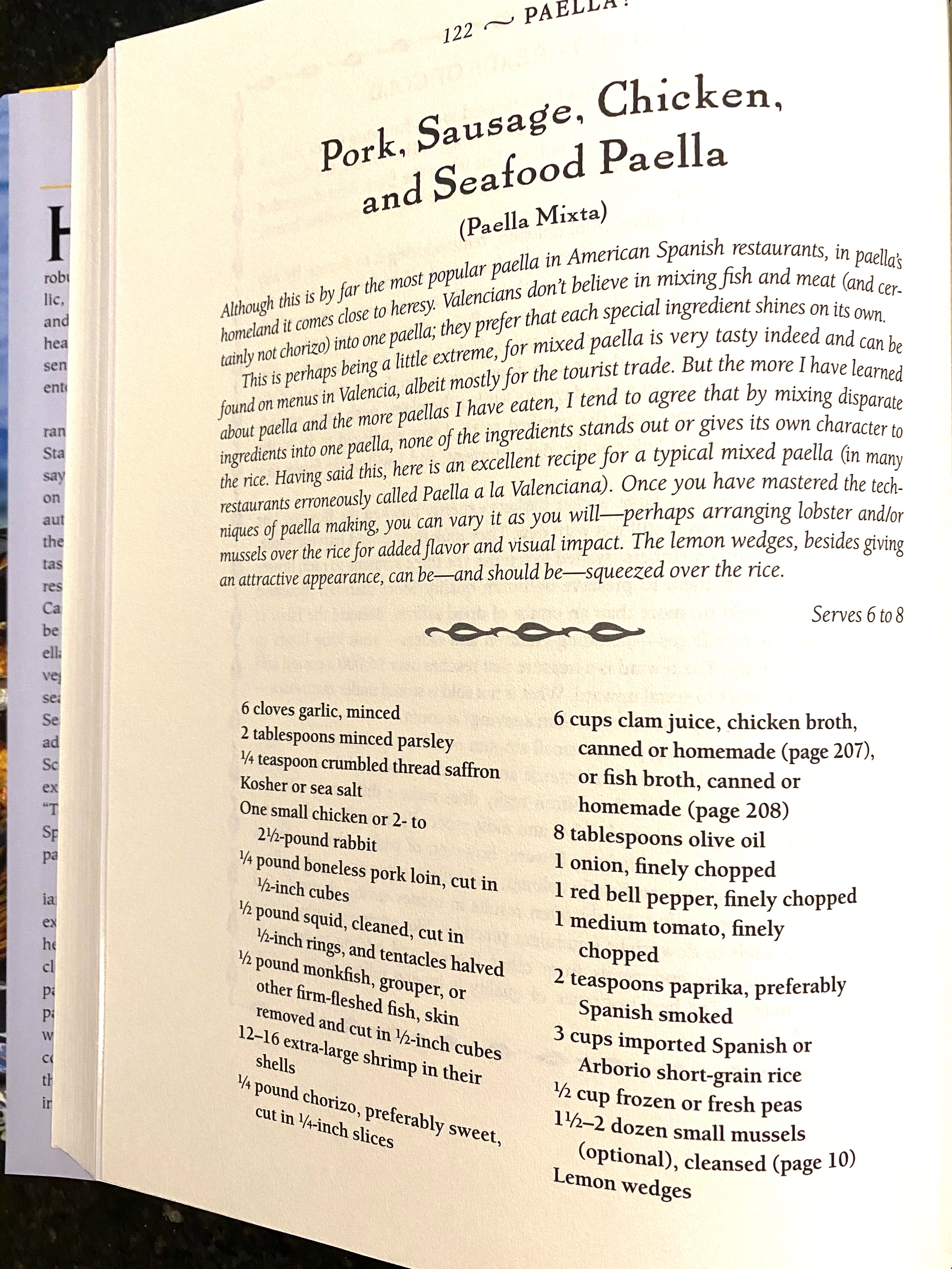 Back to the terrific Paella Cookbook bye Penelope Casas – here is the recipe I followed – loosely – to create our Paella at home – after she explains the importance of this dish to that Country: