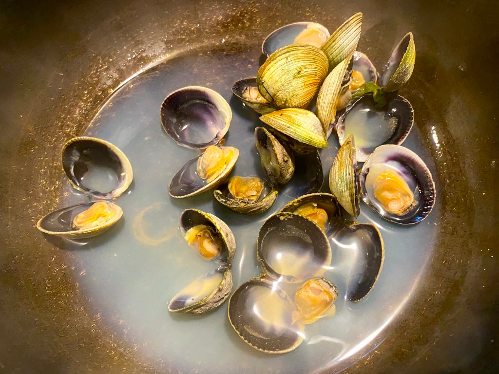 I chose to pre-cook my seafood…simmered in boiling, salted water for a few minutes – covered to steam them open…you can use that broth later if you want, but either way, most of my protein was precooked with one big exception…
