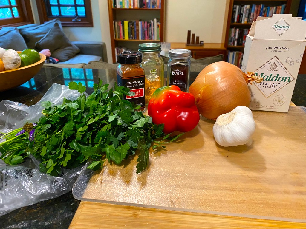 It’s a two-part process…first, prep the ingredients like onion, garlic, bell pepper so they are ready to cook, then put together all of your proteins: