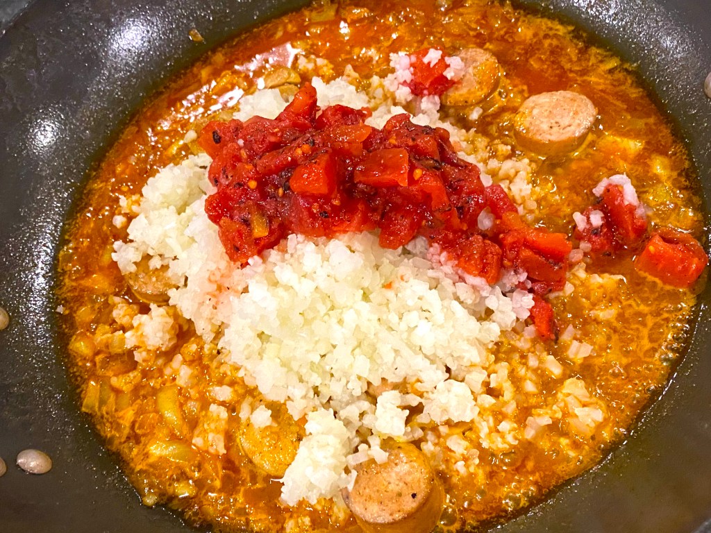 As I mentioned, I made two different recipes: Alex got bell peppers plus I also used Cauliflower Rice for hers…it works well, but I went with the traditional rice, which was pre-cooked at added now, along with some fire-roasted tomatoes: