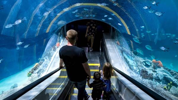 Designed by Advanced Aquarium Technologies, the aquarium includes a 551 ft long tunnel that takes visitors through a coastal reef, open ocean, a kelp cave, shark cove, and a coral reef, and is one of the longest such tunnels in the world.