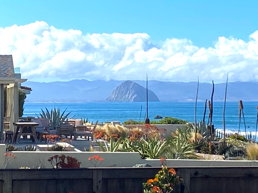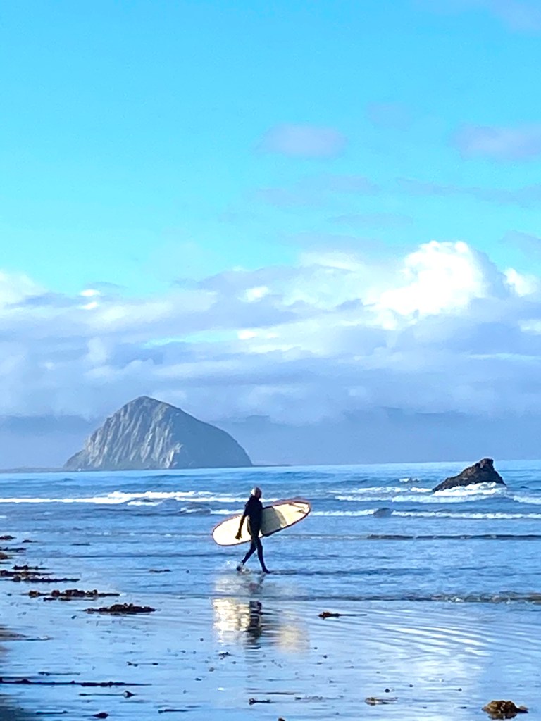 As you can see, when the morning clouds lifted, the incredibly pristine beach from Cayucos to Morro Bay was an incredible sight – as was this surfer getting ready for his daily ride in the show of Morro Rock: