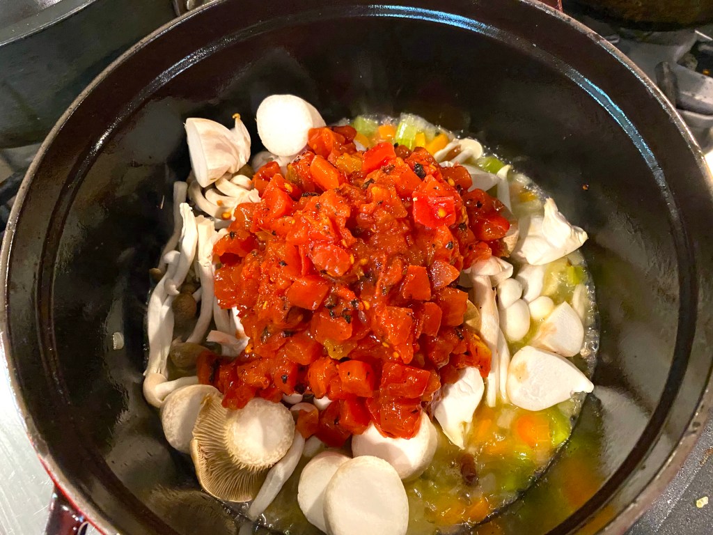 Add crushed canned tomatoes, water or broth, your fresh mushrooms and then the spices that give it a pop: salt, freshly ground pepper, ground paprika, turmeric and dried basil.