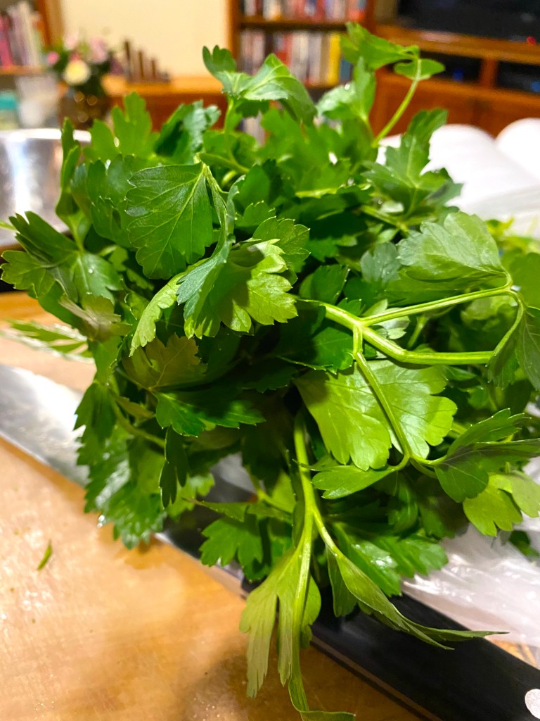 While the Veal Shanks are cooking in the oven, time to make some sauce, and for that, you need the greenest parsley you’ve ever cooked with: