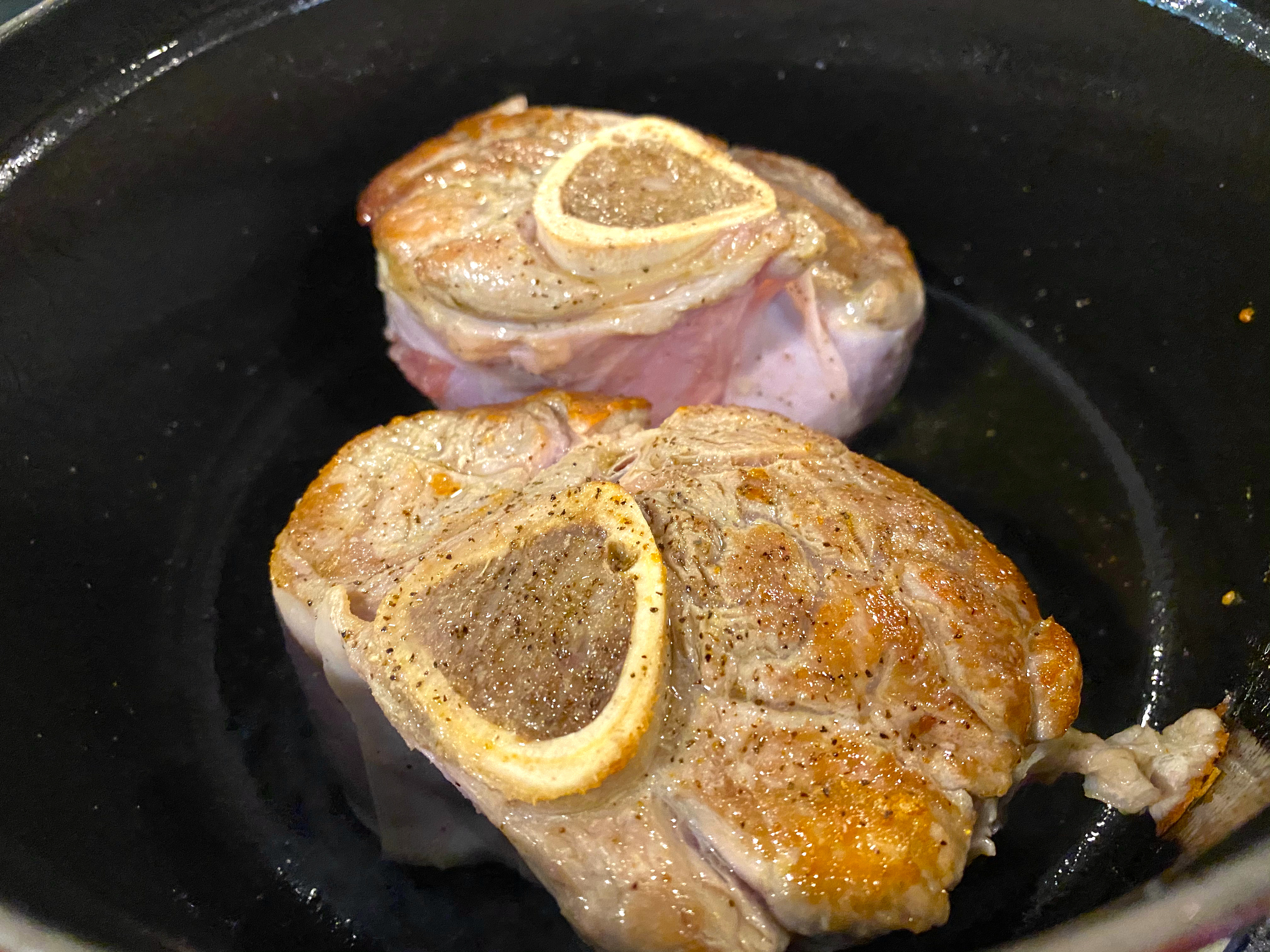 Preheat your oven to 350 degrees, then grab a dish that you can put directly into the oven later. Heat the olive oil and cook each side of the Osso Buco / Veal Shank for 2 to 3 minutes…they will look like this before and after you flip them: