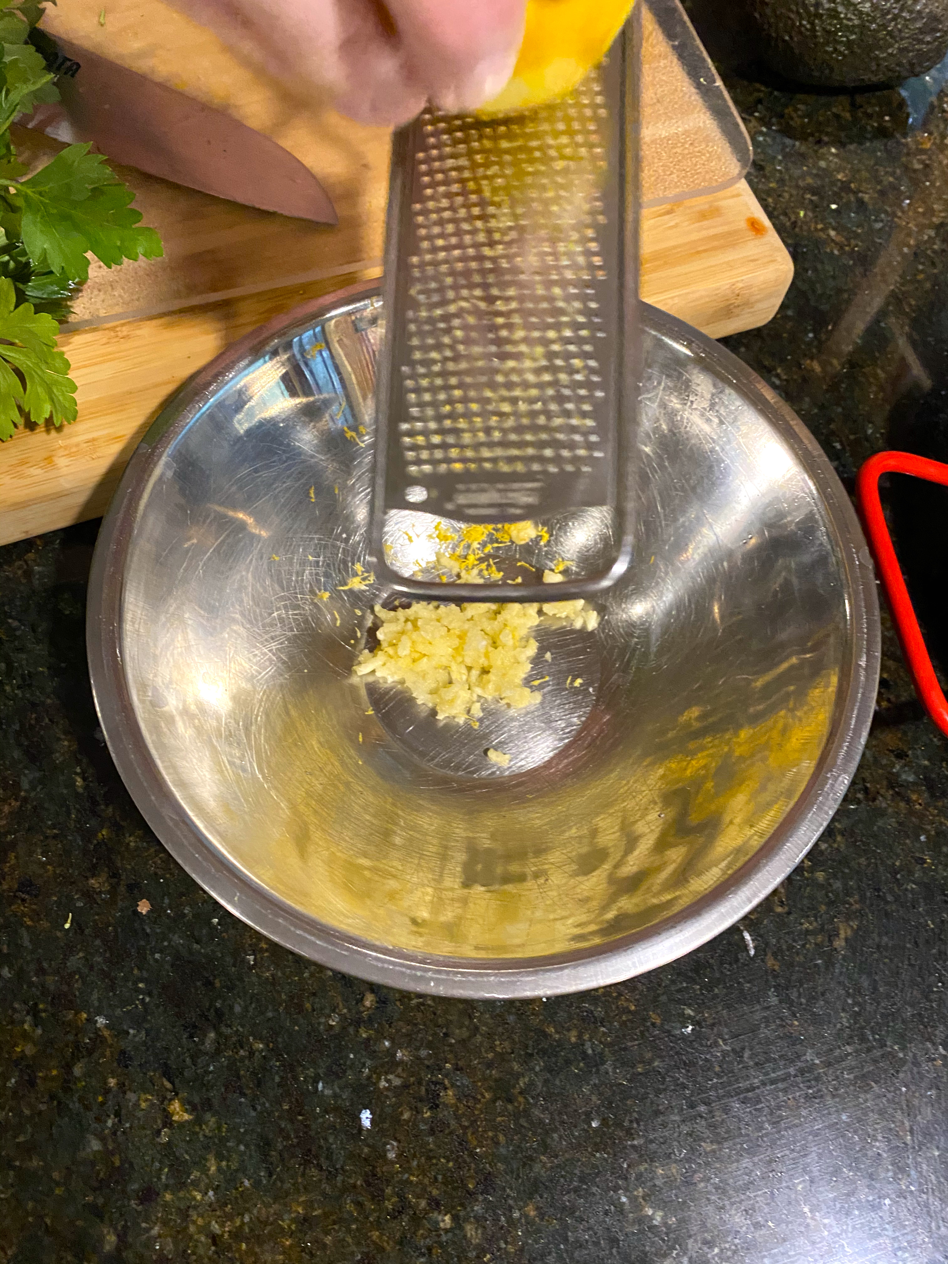 First, grate some lemon zest into a bowl…I say it’s a matter of taste, but I really enjoy the tart nature of the grated skin: