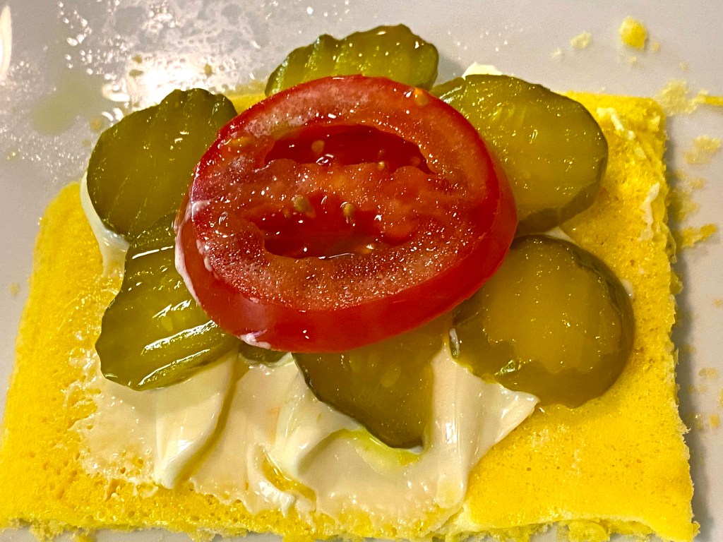I let the cheese melt a bit more than this picture shows, then I dressed my “oopsie” bun with my favorites: dill pickle chips, a slice of tomato and of course, mayonnaise!