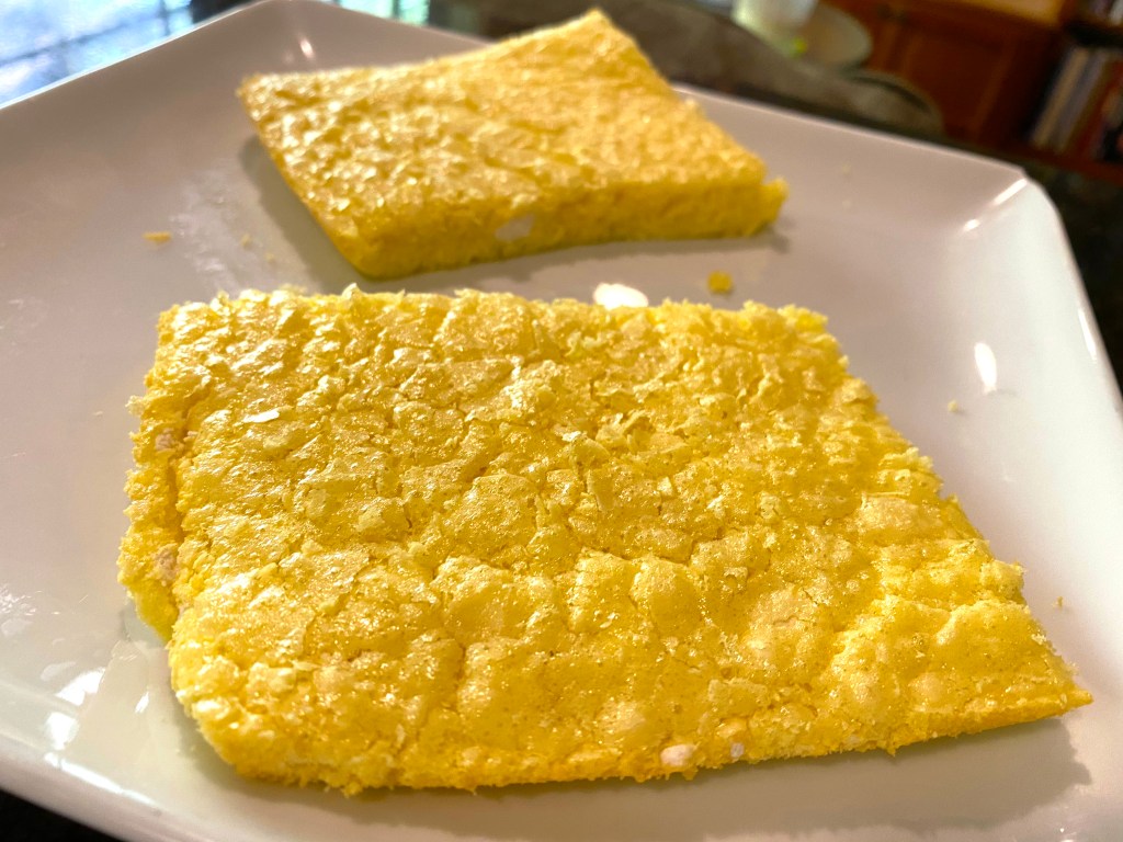 I immediately realized my batter was far too thin to shape it, so I put a thin layer in a pan as you can see and baked it – and guess what? It turned out perfectly for me to cut these two “buns” out – although mine were square!