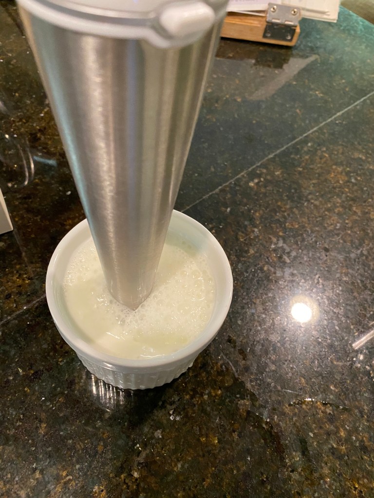Next, I blended my egg whites into a frothy foam….well, probably no where near as frothy as they’d like, but once that was done I put my Mascarpone cheese into a bowl with the gg yolks and some salt and blended that as well:
