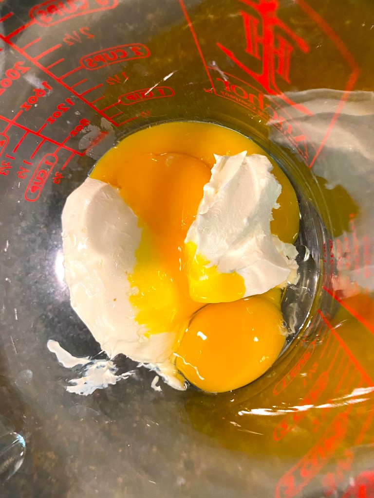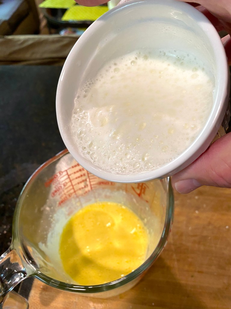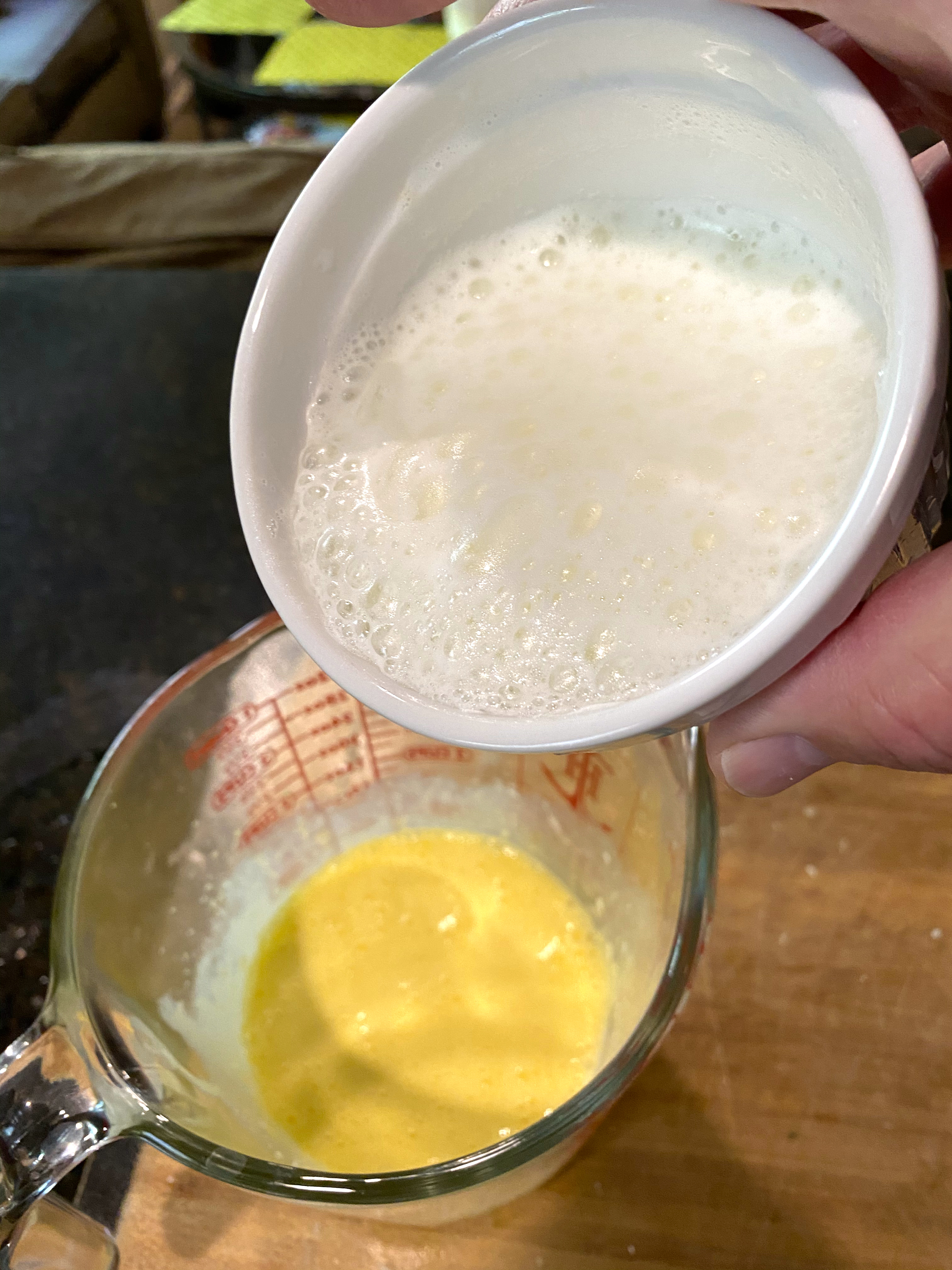 Next up, you combine the white frothy egg whites and the yolk/cheese mix to create your batter: