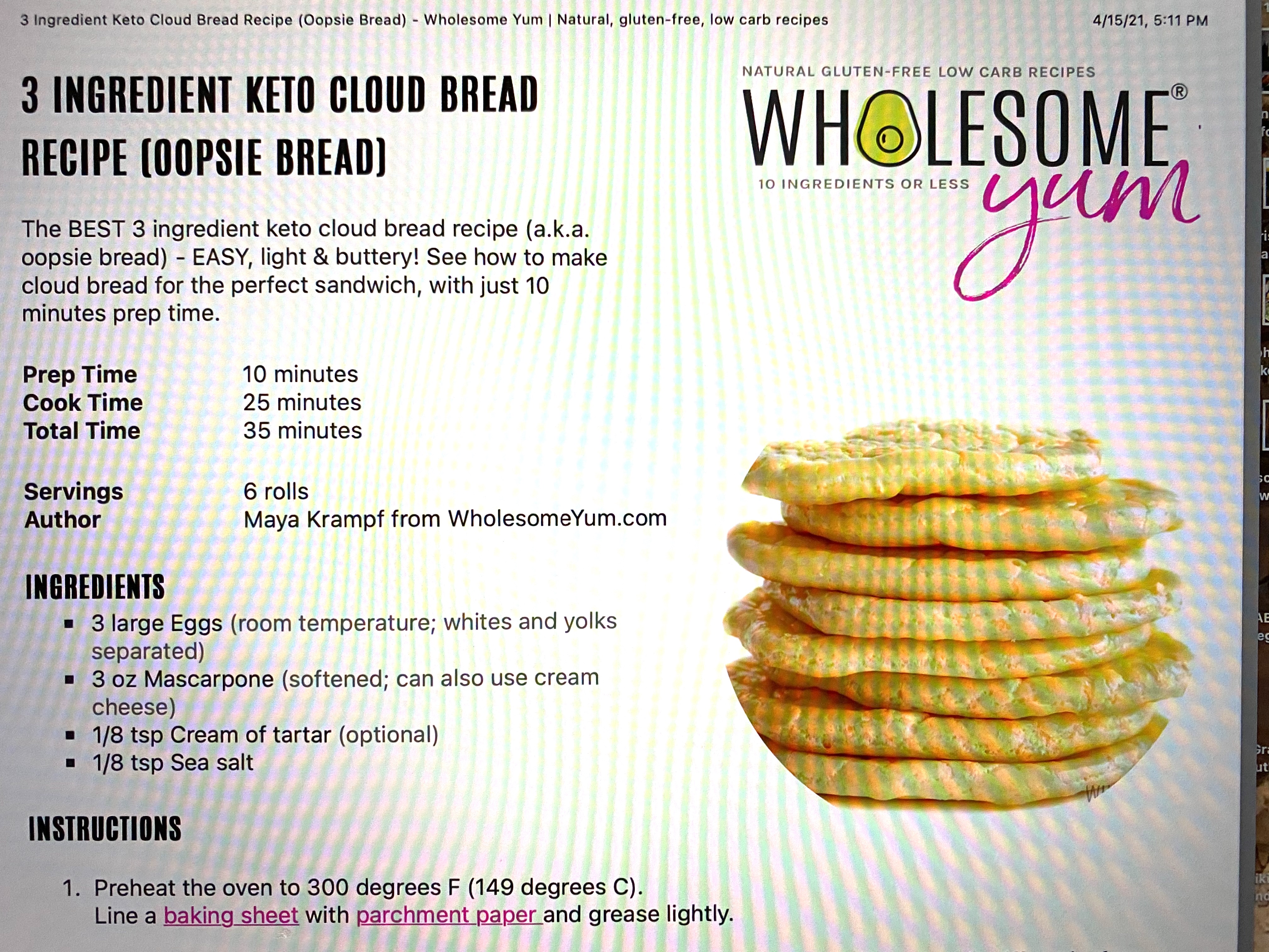 I gathered the very few ingredients needed for the “Oopsie” bread – minus the cream of tartare which I didn’t have – and followed this very easy and fun recipe!
