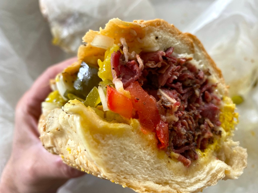 The pastrami is cooked perfectly, then dunked in some au jus before being put not he sandwich – followed by lots and lots of extras: