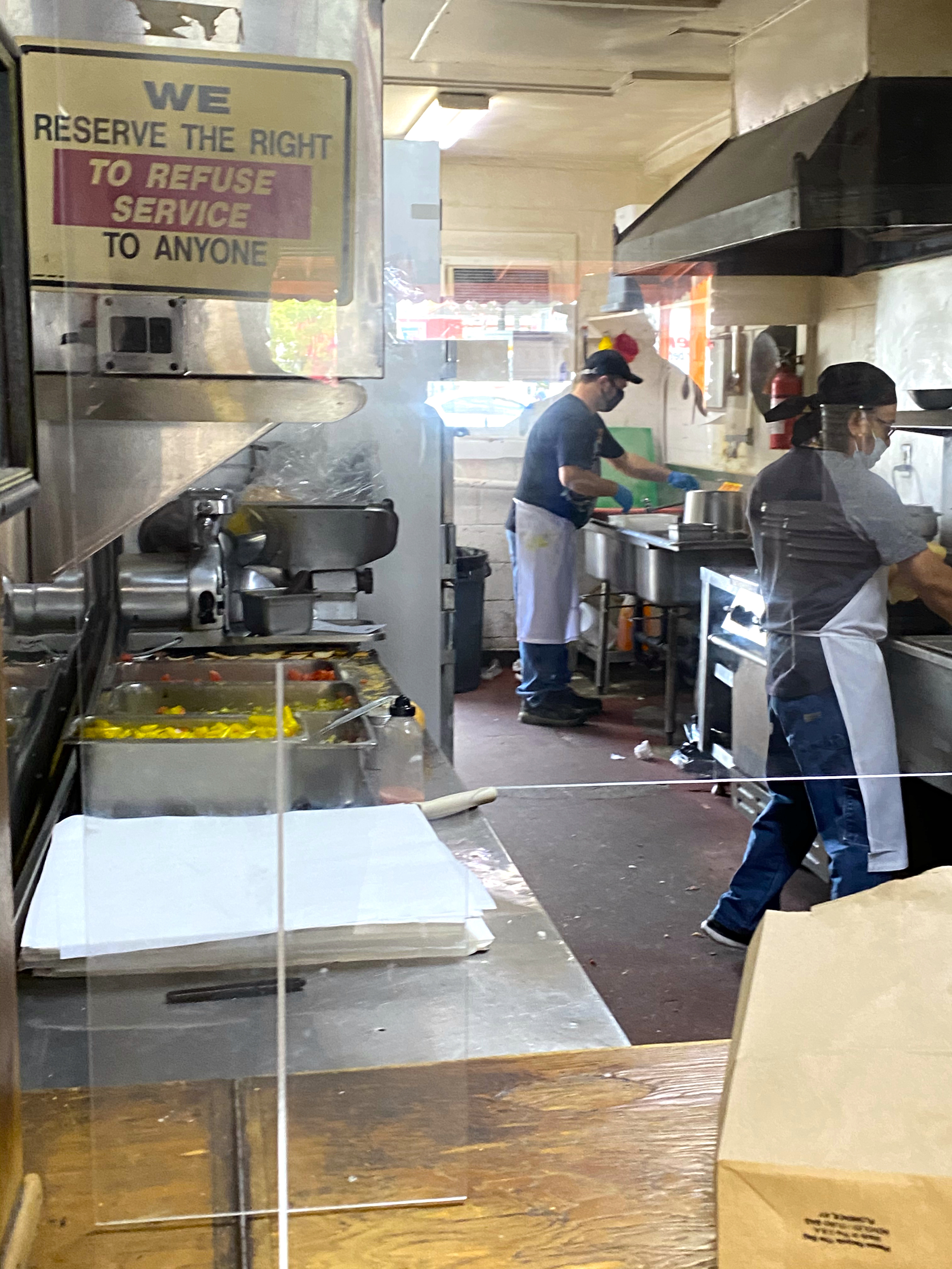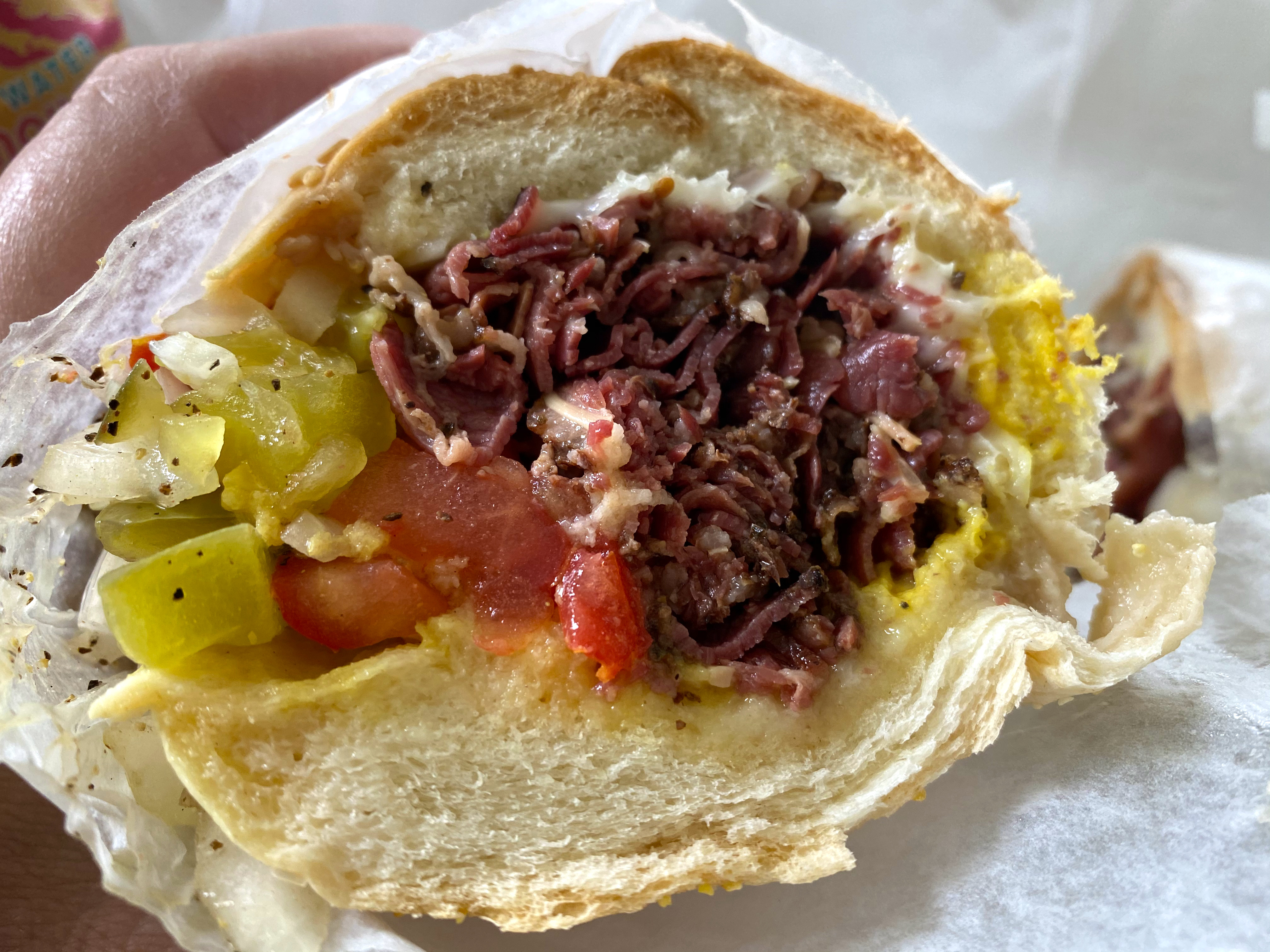 It was a two person team the day I was there: freshly made buns being stuffed with the works: pickles, tomato, onions, peppers and lots and lots of pastrami…