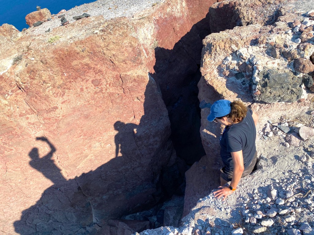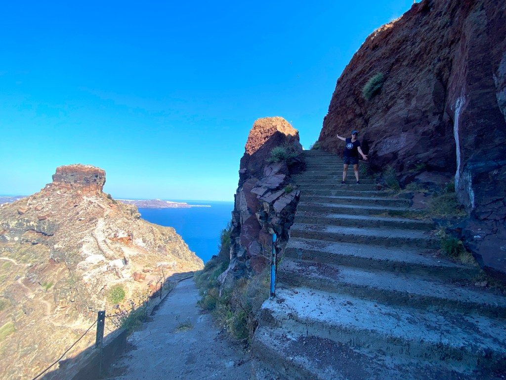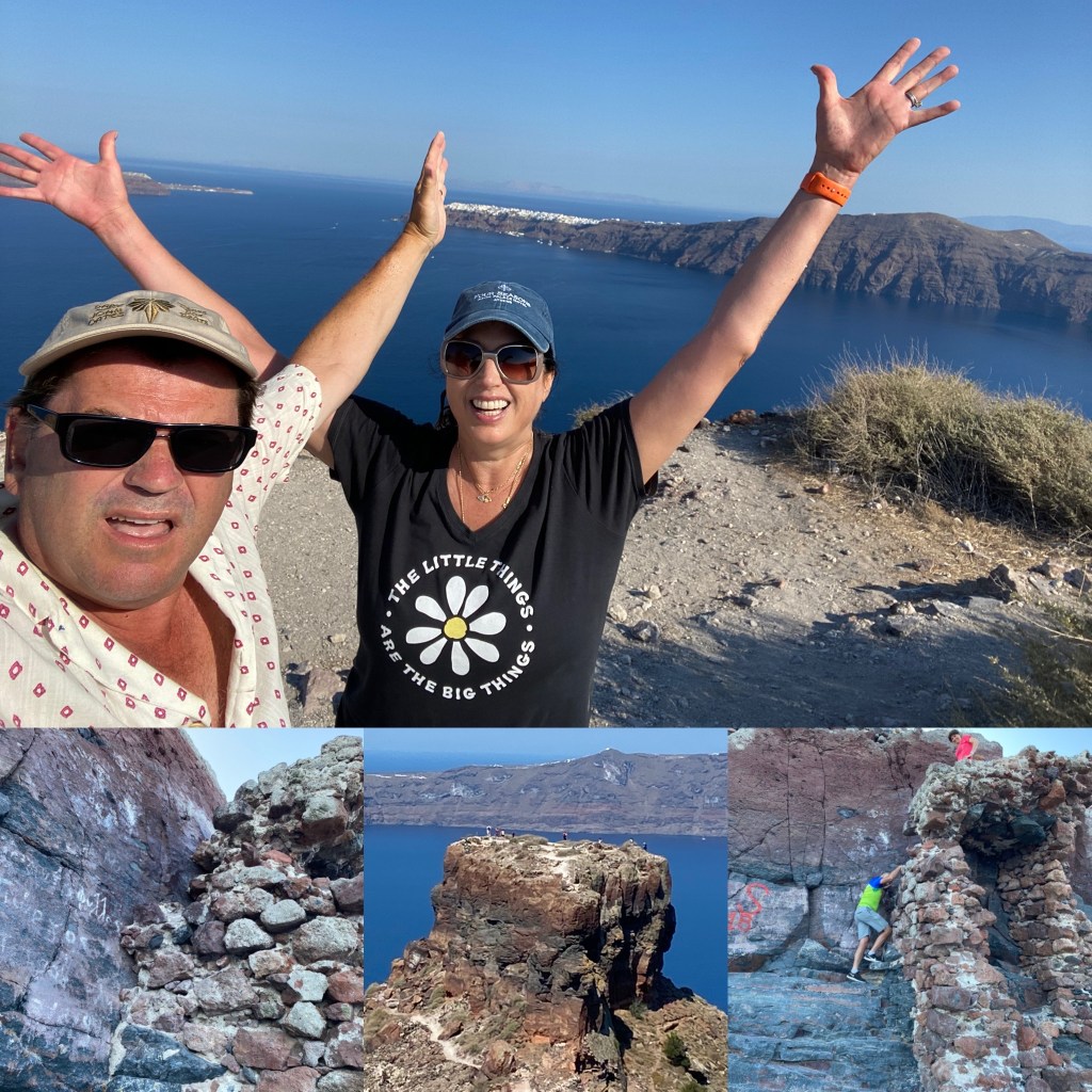 You can clearly see the far side of the caldera and the town of Oia in the wide shot…and from the back, this is what the rock looks like – with virtually no path visible for continuing upward…