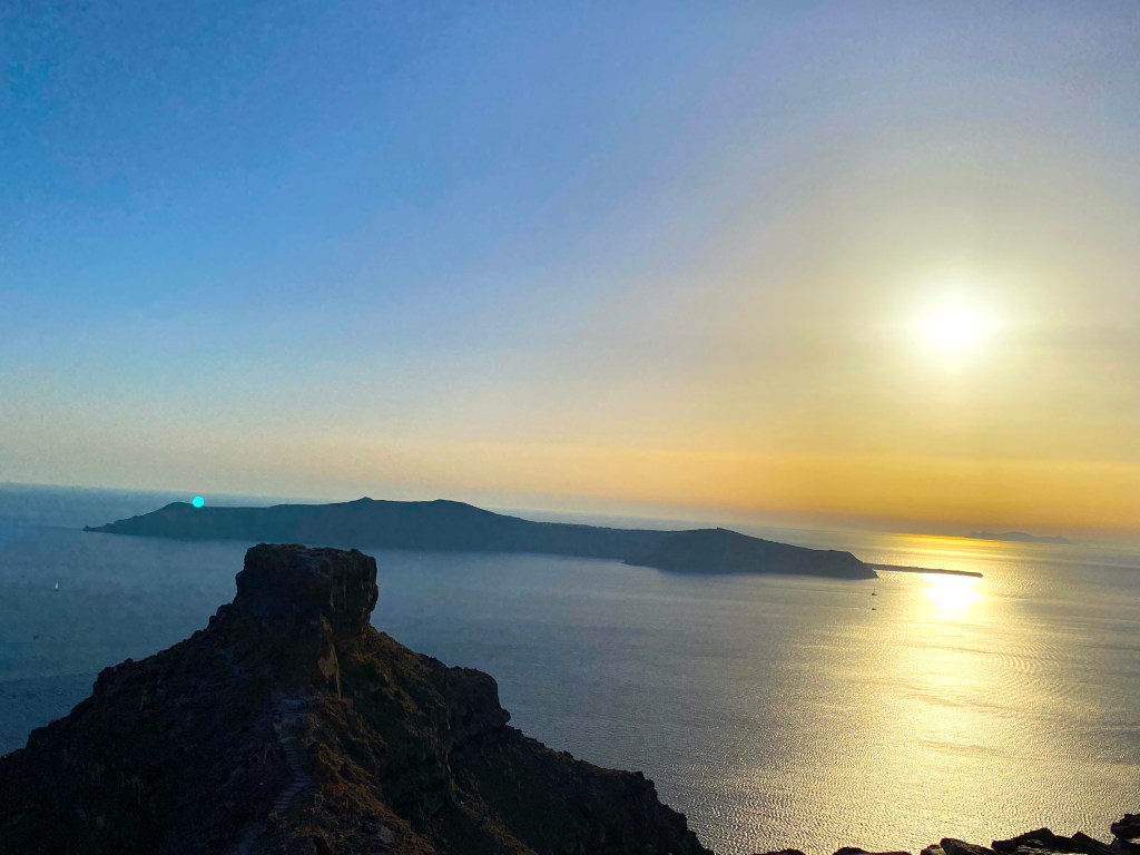 See those brave souls on top of it? Skaros Rock rises over 500 feet high, perched on the edge of the town of Imerovigli, which itself is perched on the edge of Santorini’s famous “Caldera”, the shell of what was once a massive volcano….here’s an idea of what we saw every day from our room: