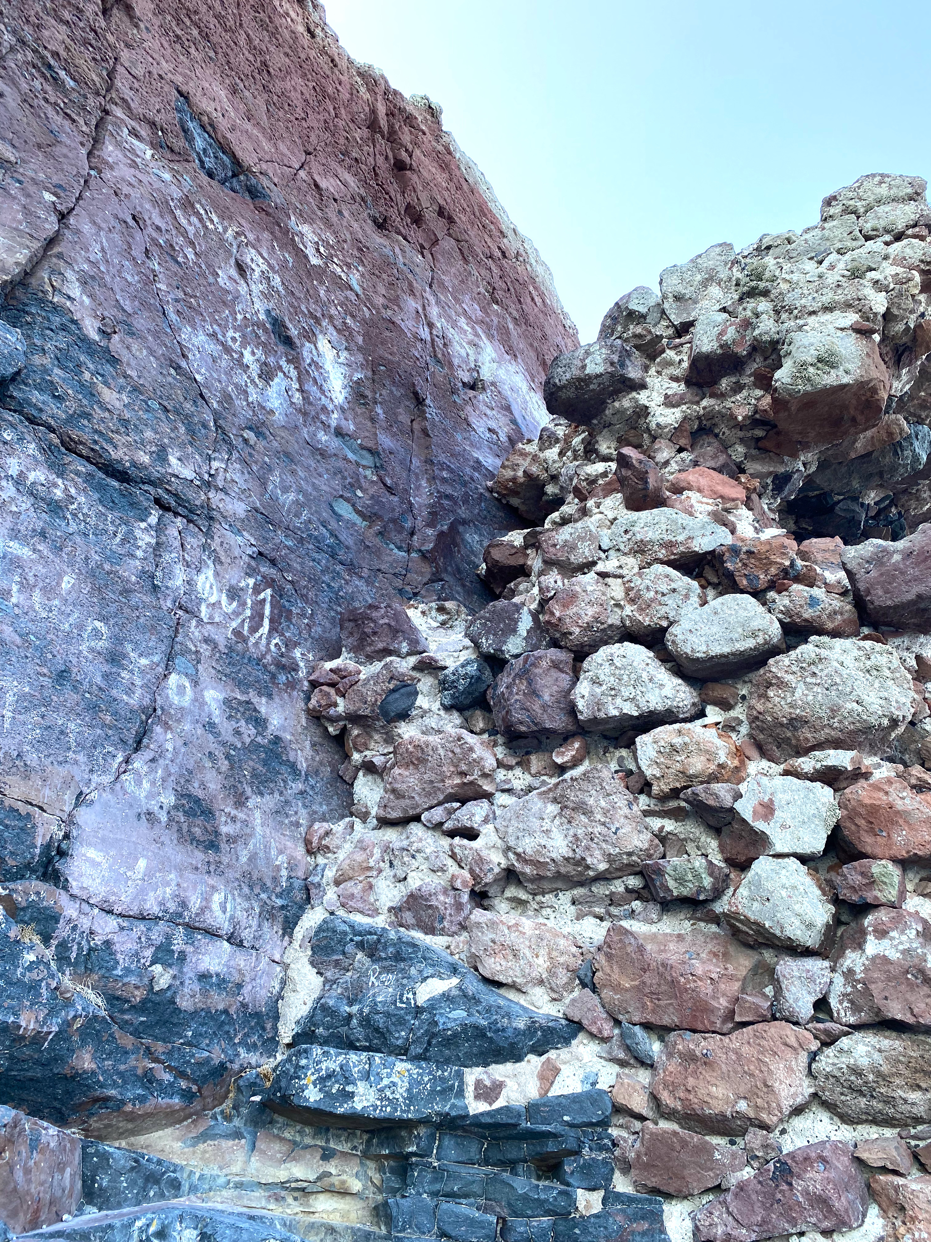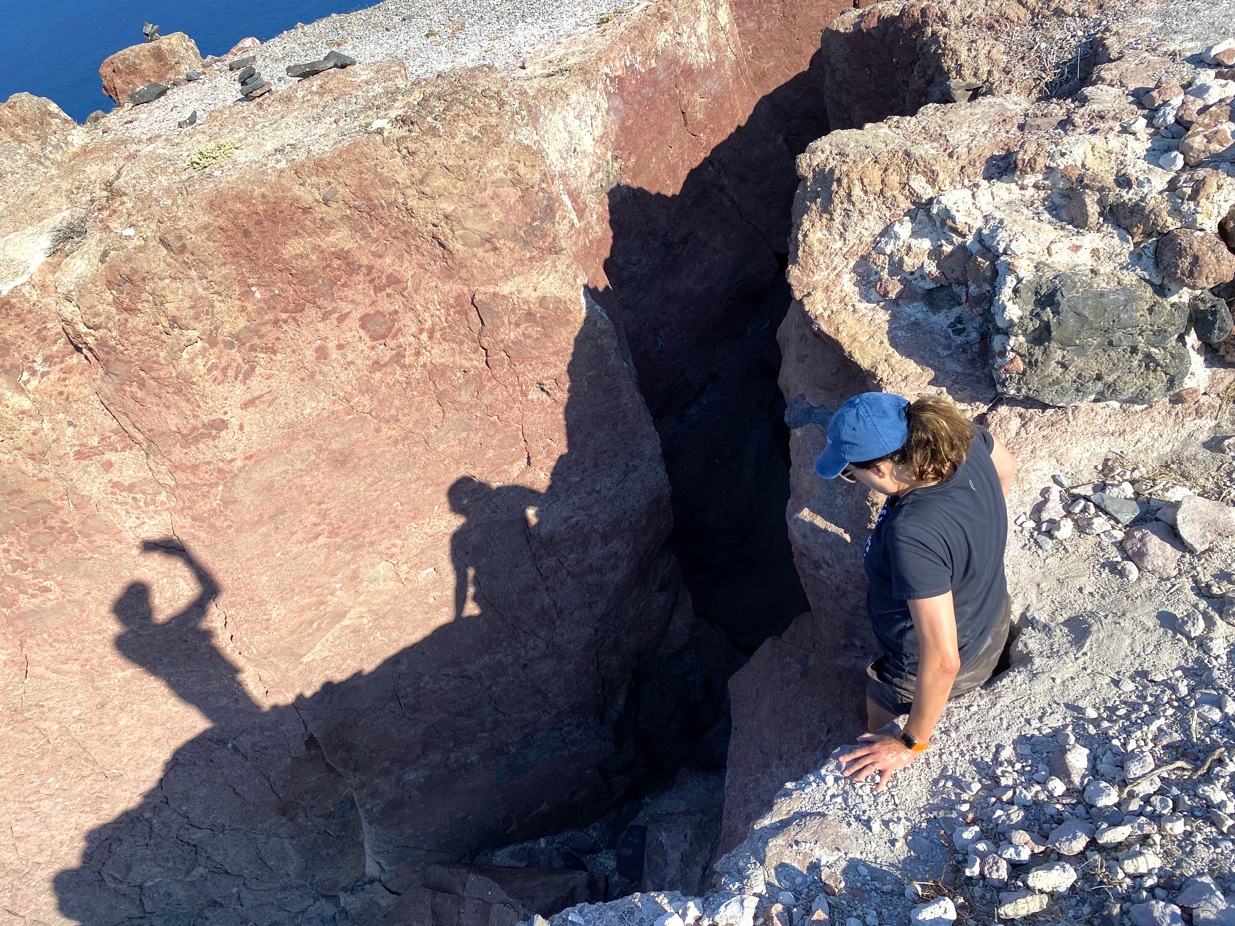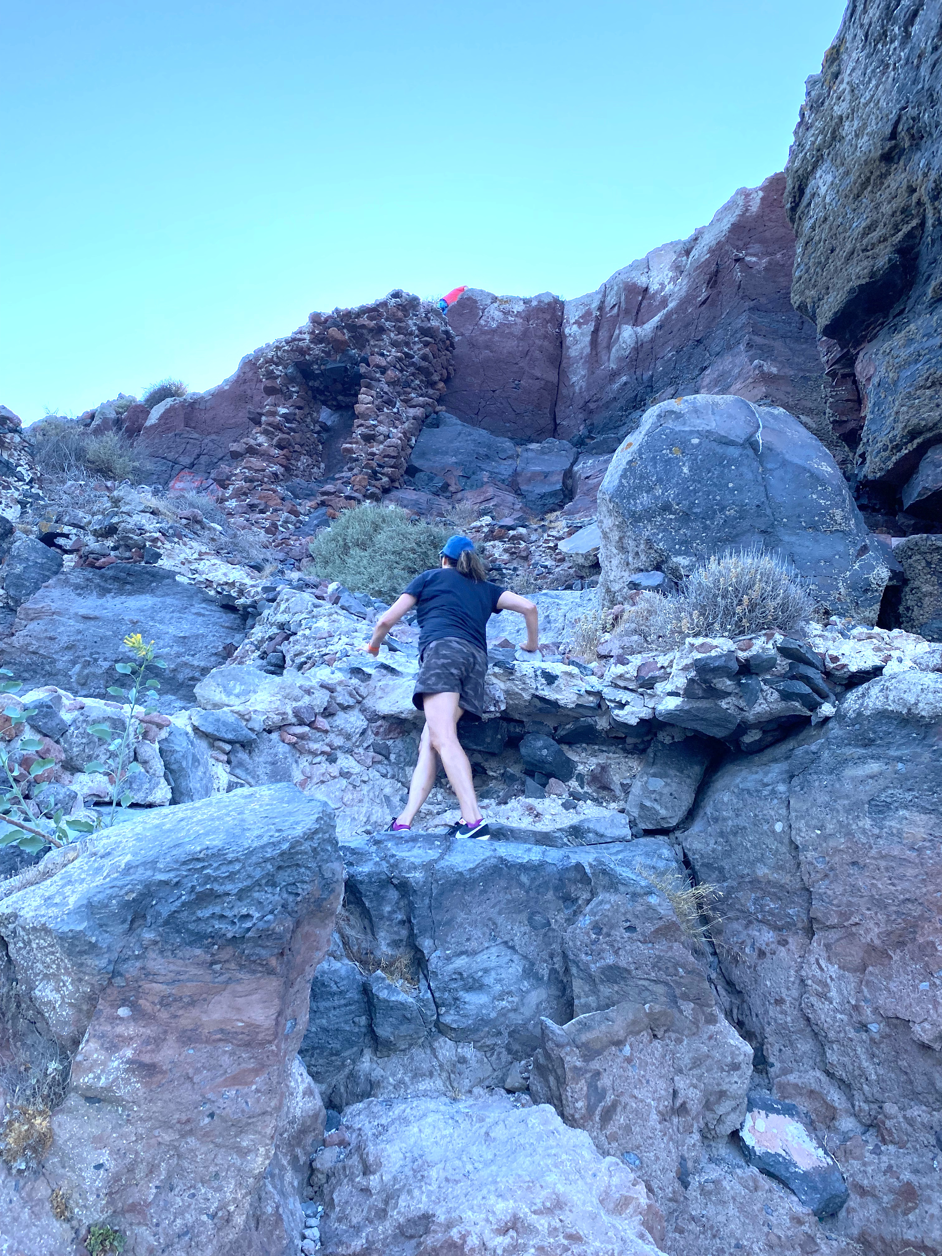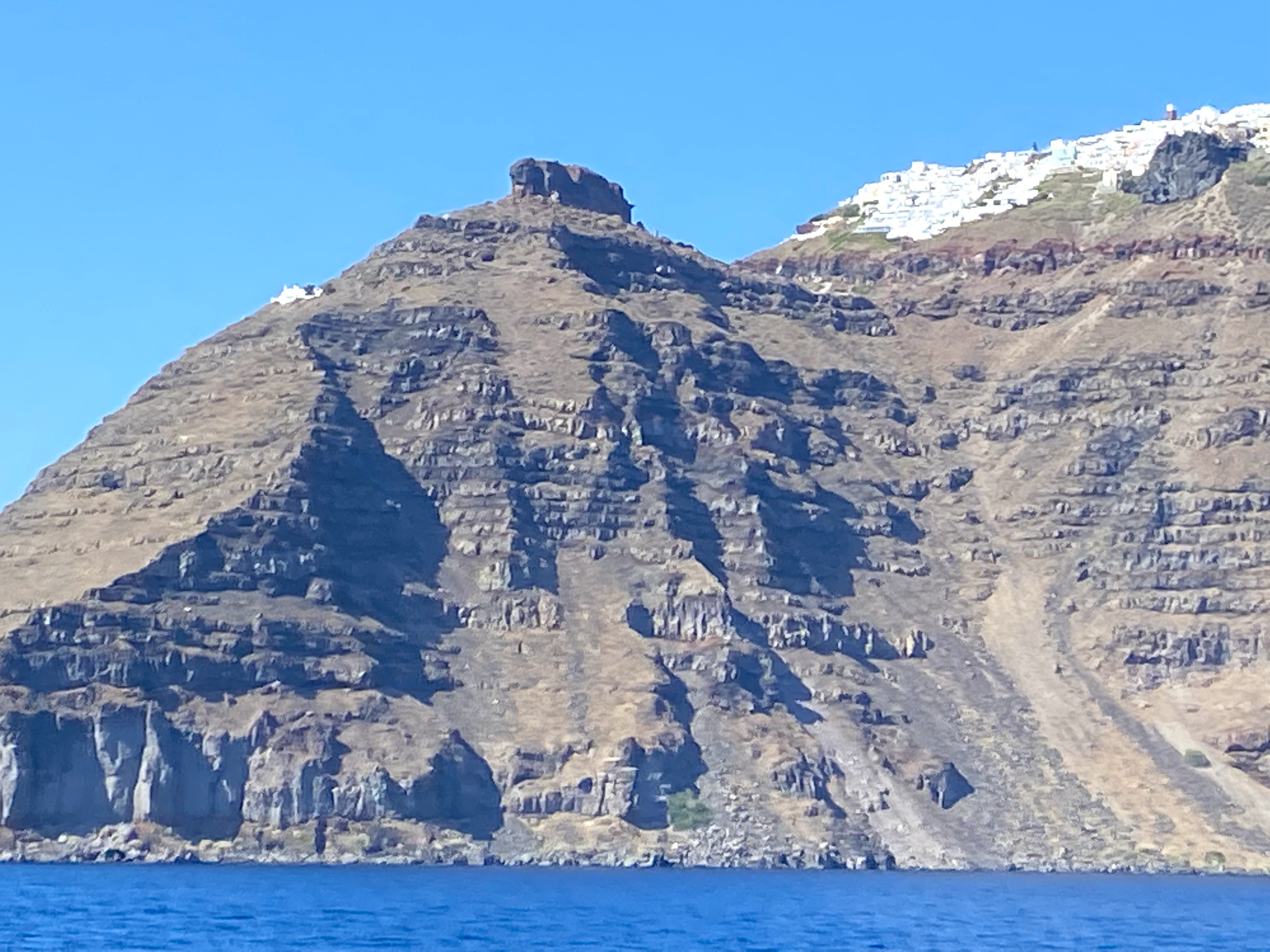 You can clearly see the far side of the caldera and the town of Oia in the wide shot…and from the back, this is what the rock looks like – with virtually no path visible for continuing upward…