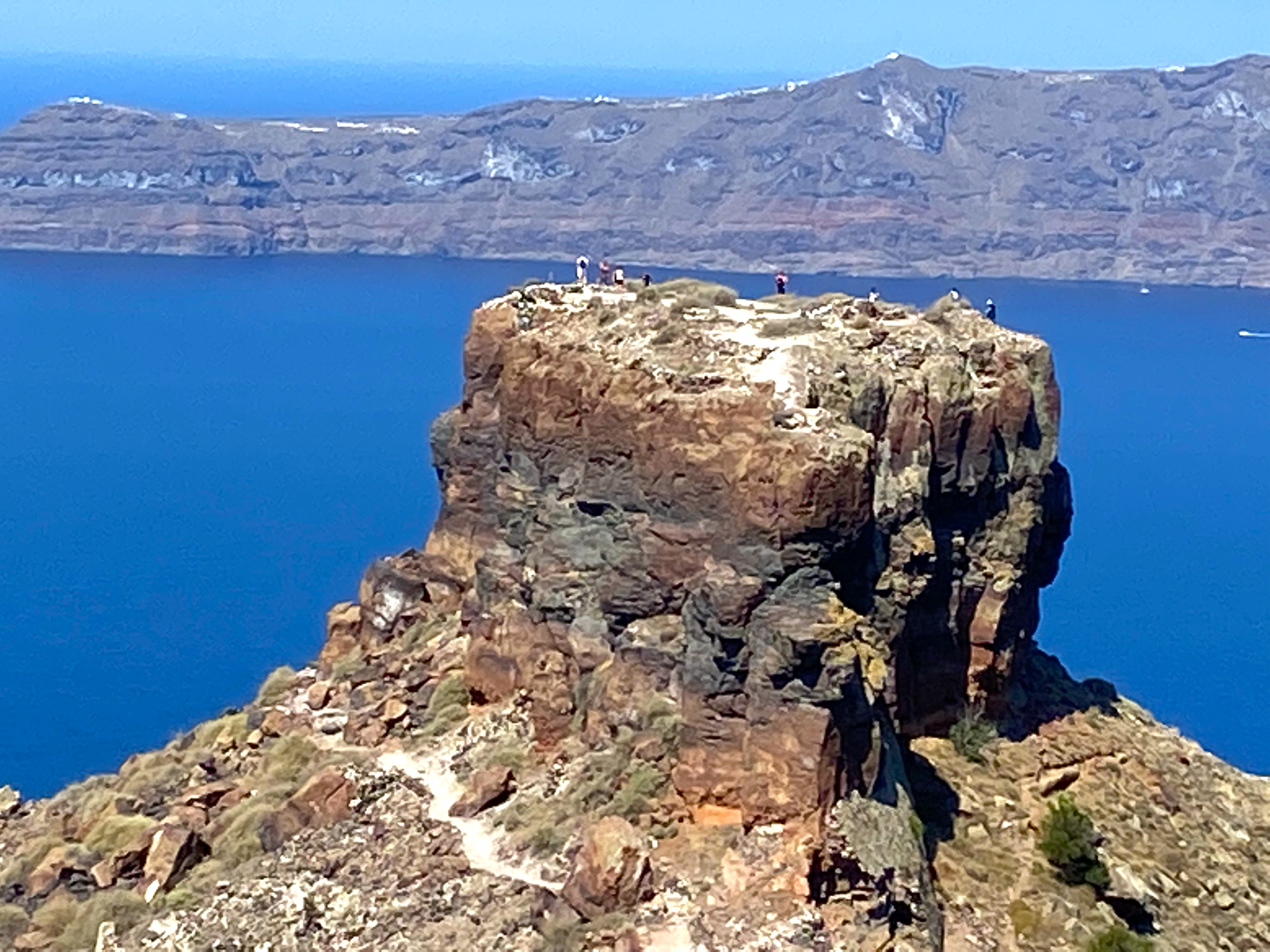 Alex celebrated by doing a pose, with Oia inching close to us…and looking back, this is what Imerovigli and Skaros Rock look like: