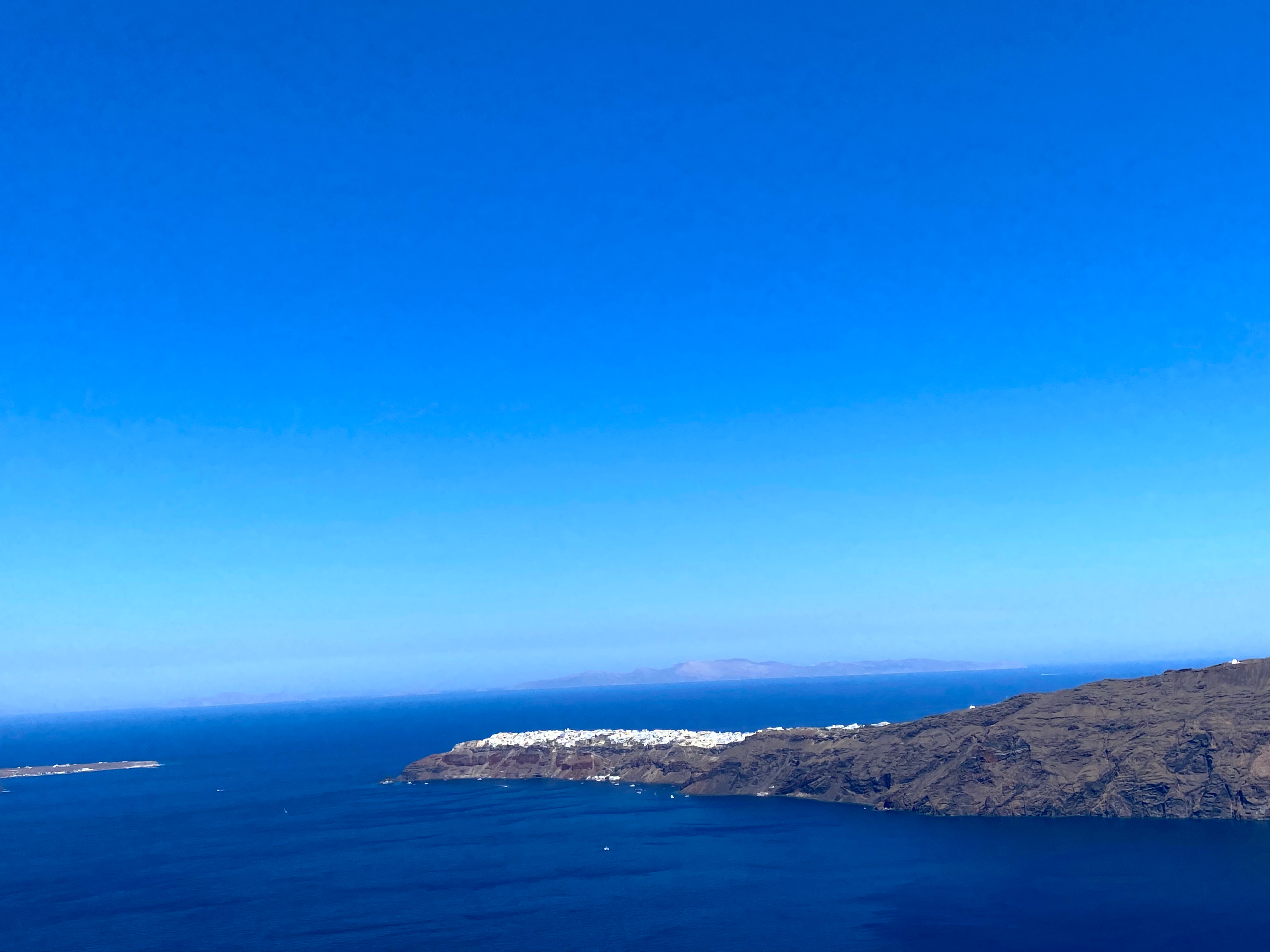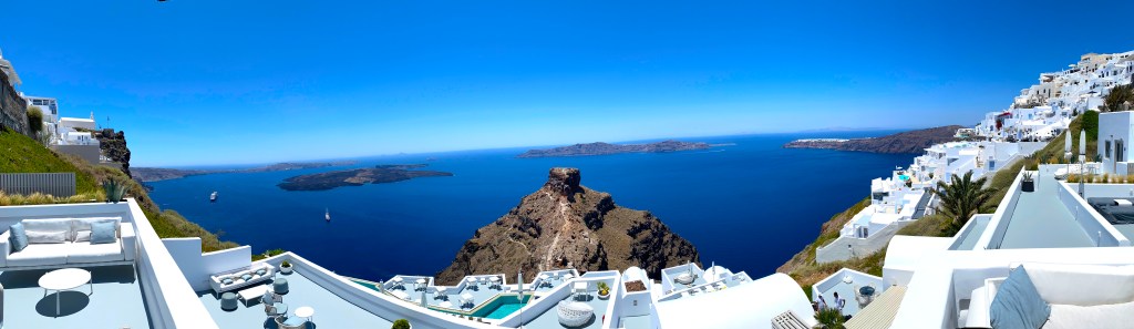 This panorama shot from our Hotel is the only way to capture even part of Santorini’s incredible Caldera – the shell of a volcano now filled partly with the Aegean Sea!