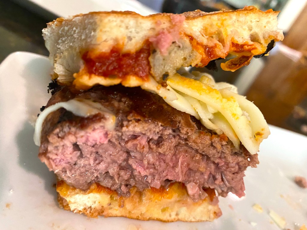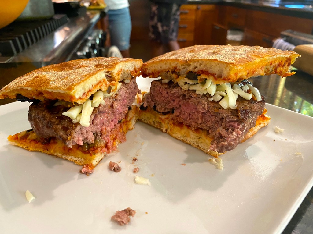 There you have it: a mouthful of juicy burger, “buns” filled with red sauce, cheese, sausage and black olives!