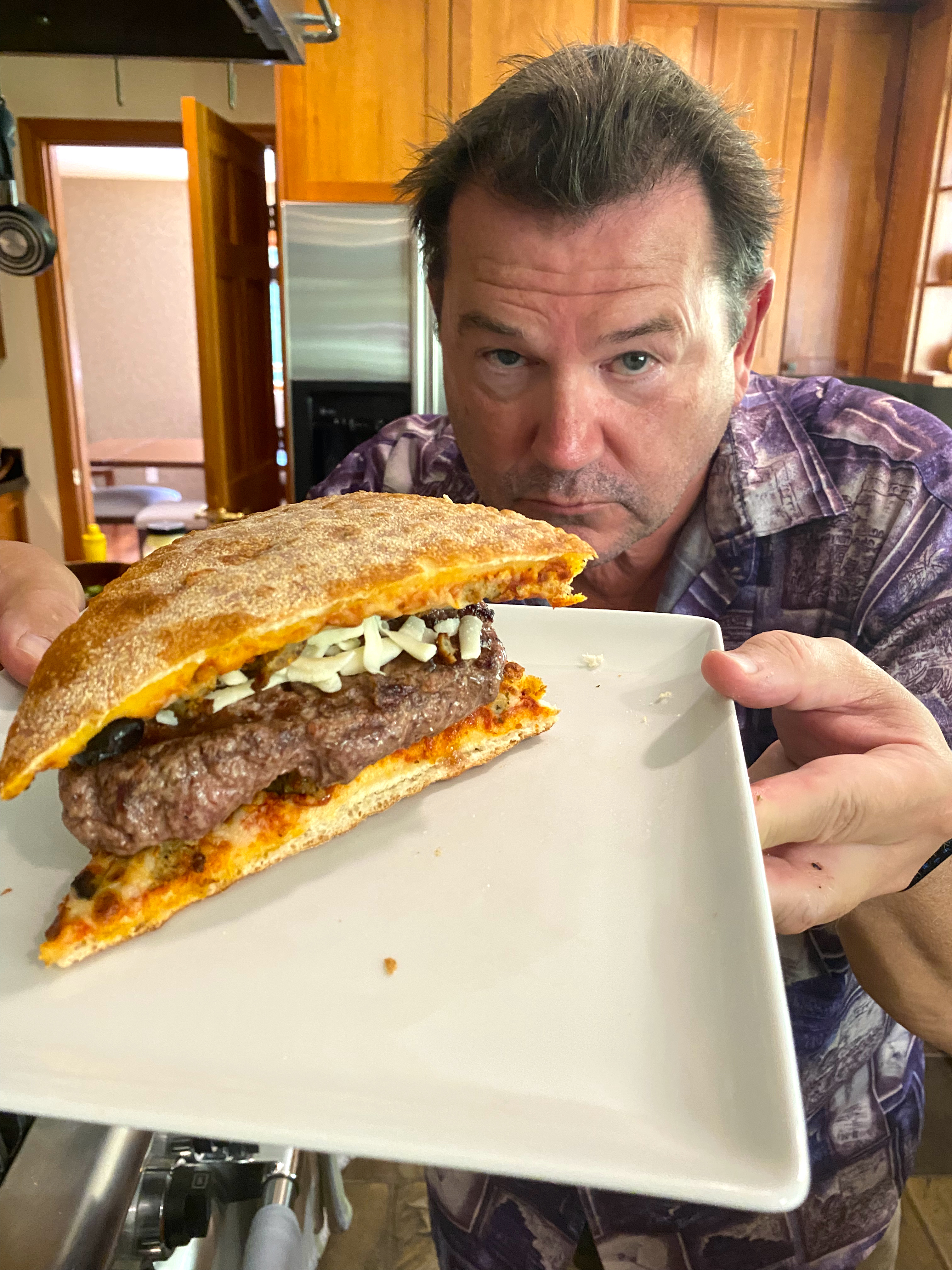 Wait…I’m a bit confused… You mixed two slices of pizza in with the hamburger and then used two more slices of pizza as the buns. Is that it? I didn’t see any pizza in the burger when you showed the sliced into shot. Did the mixed in pizza somehow cook out? Wild idea–may be worth trying some day. Cheers