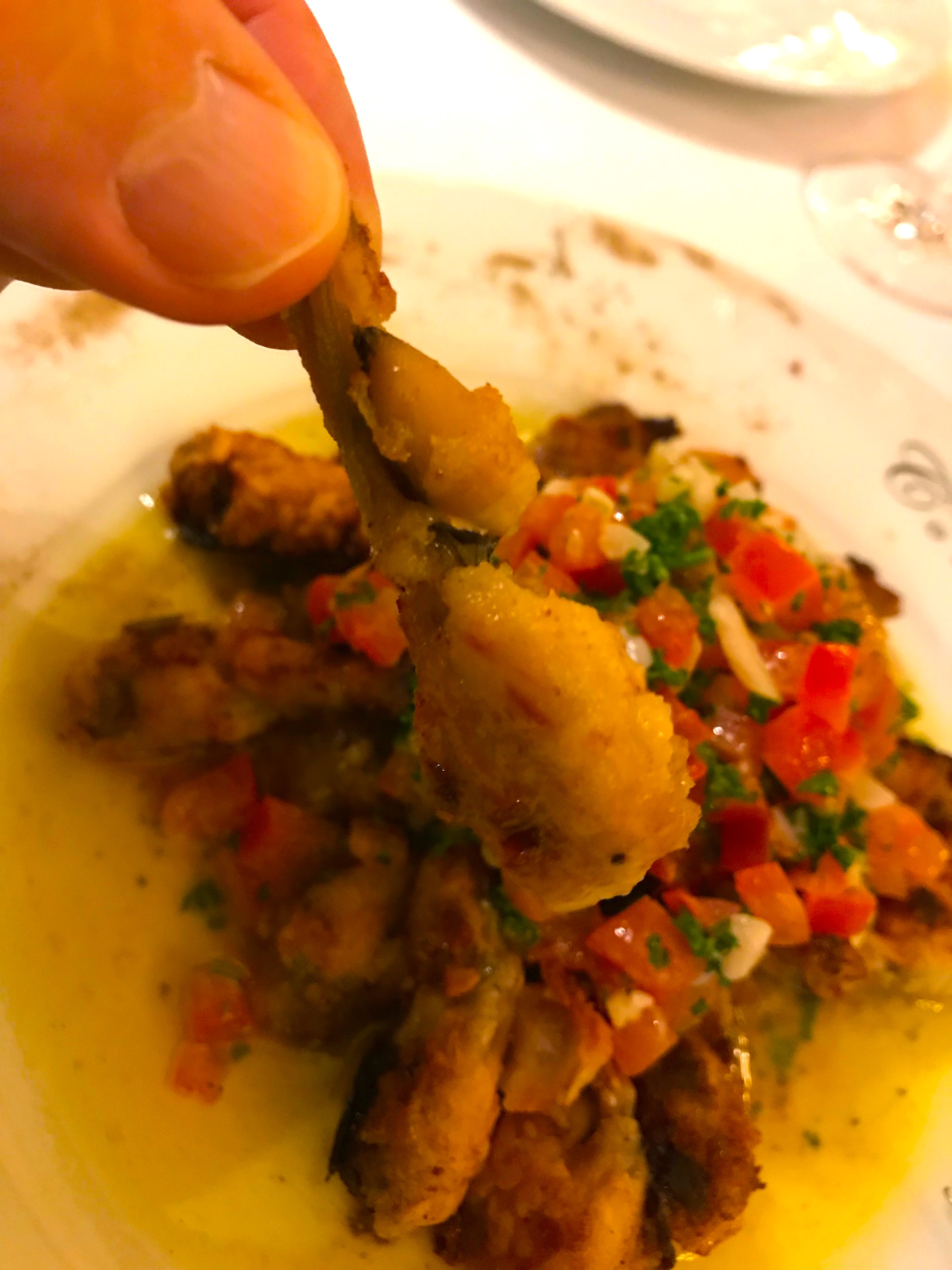 Frogs Legs aren’t served that much in the US, but they are should be! These were served “provencal style”, meaning they were covered with a delicious blend of diced tomato, garlic and parsley…the legs themselves were lightly breaded and pan fried – moist and succulent…and delicious!