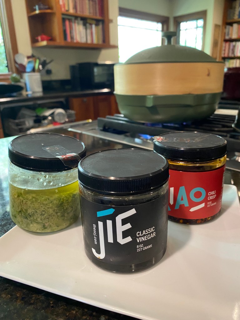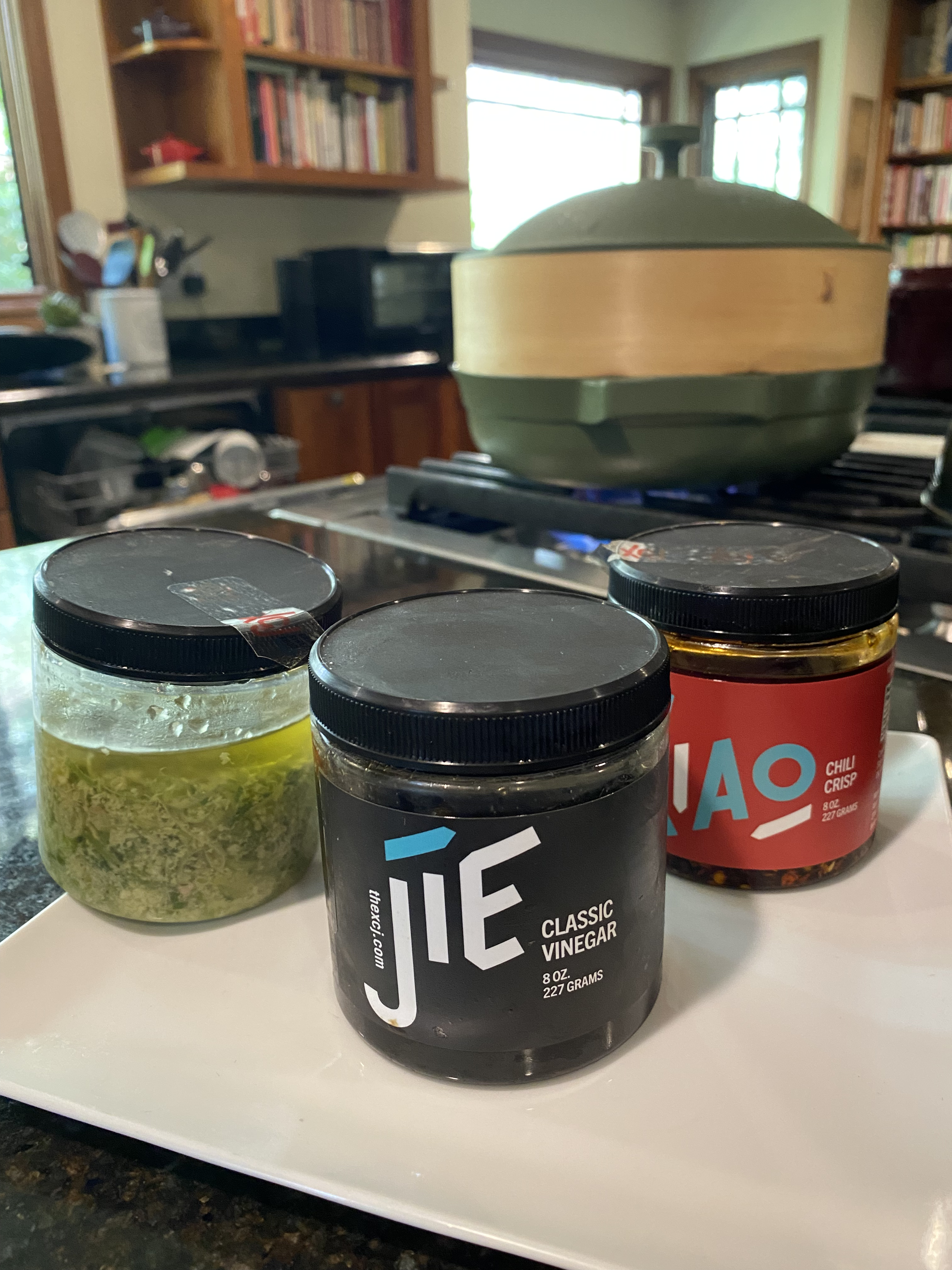 Classic Vinegar and Chili Crisp are both delicious – but the Scallions in Vinegar And Oil is amazing – and while, as I said, the traditional way to eat a Soup Dumpling is to bite the corner and drink the juice first, I like mine this way: